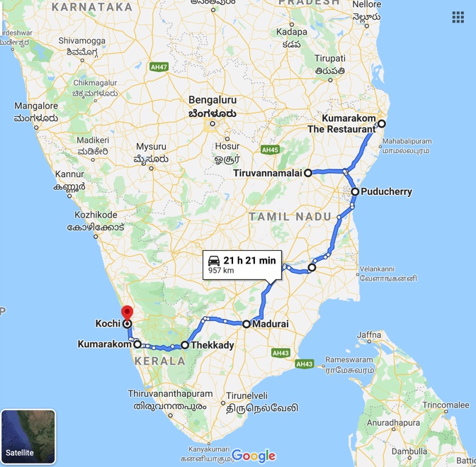 - Mi recorrido fue de 957 kilómetros atravesando el país por carretera de este a oeste, desde Chennai en la Bahía de Bengala hasta Cochin en el Mar de Arabia.