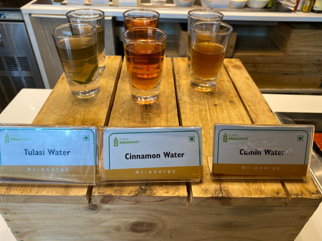 En el desayuno me llamaron la atención unos vasitos pequeños, tipo shot, con distintas aguas: tulasi, canela y comino. No, no las probé, la idea de tomarme un shot de comino o de canela empezando el día realmente no me entusiasmó. No tenía idea de lo que era tulsi, en lo que tuve oportunidad lo investigué y me arrepentí de no haberlo tomado.