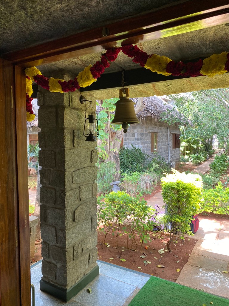 El Hotel Sparsa resultó ser un sitio muy bonito, con cabañas distribuidas entre jardines sencillos pero muy agradables. En la recepción nos encontramos con un hermoso arreglo de flores y en una esquina estaba Ganesh dándonos la bienvenida.