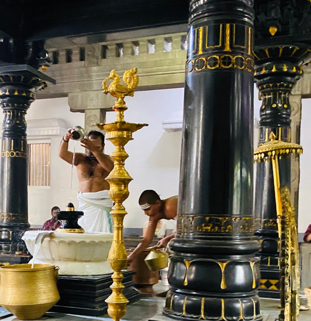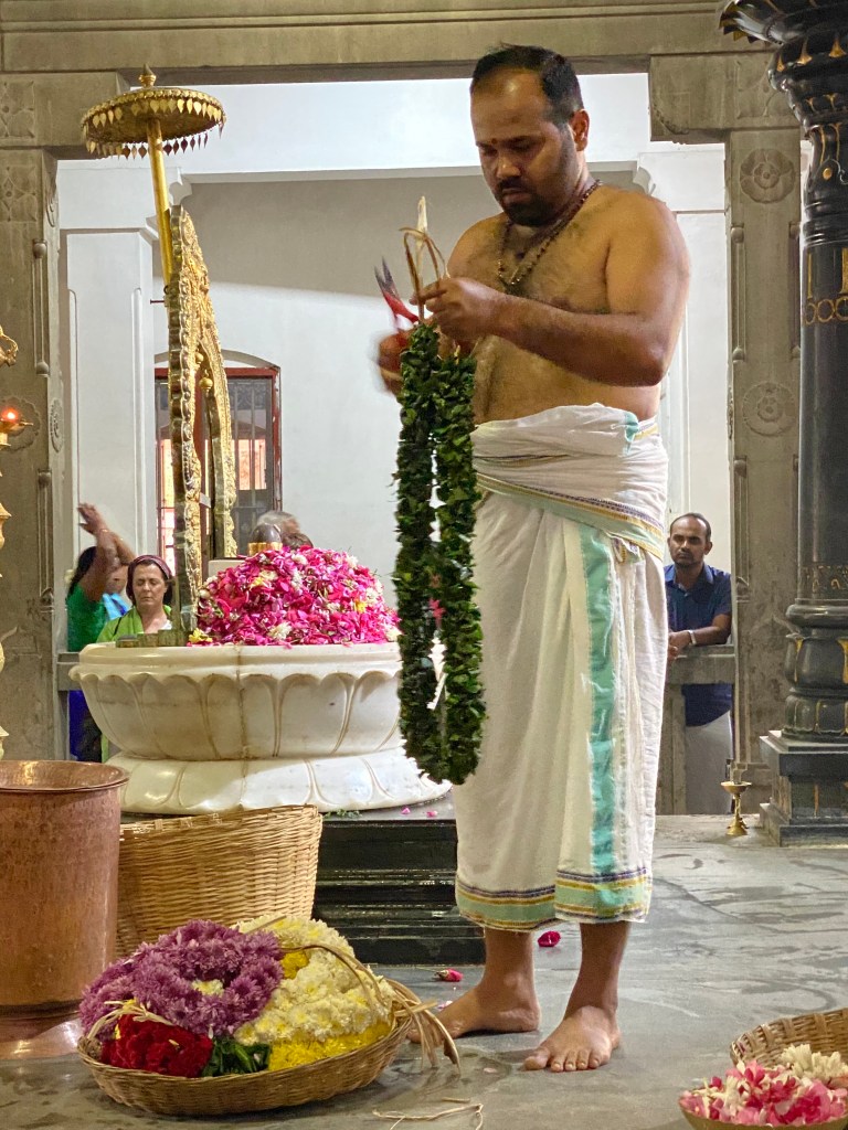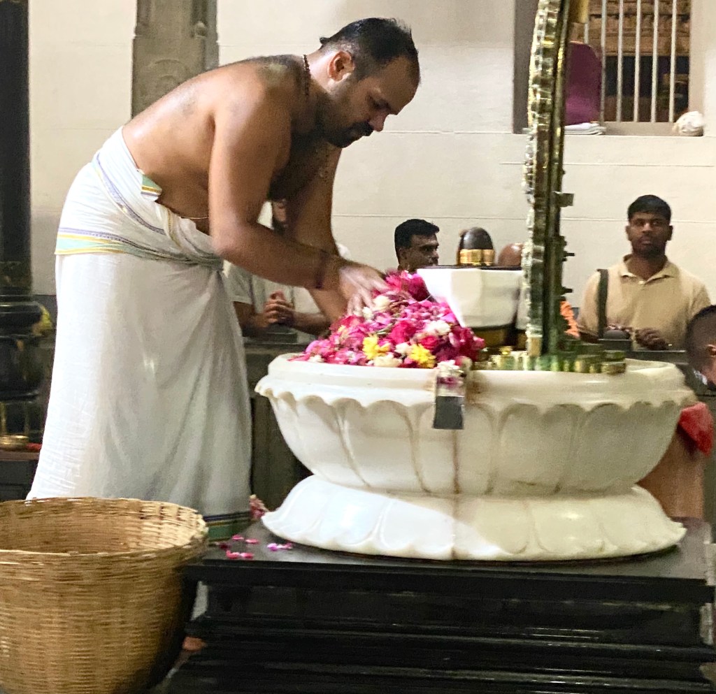 Como a las 4 y media empezó en el templo donde están los restos de Ramana, templo Matrubhuteswara, una ceremonia que resultó muy interesante. Mientras un grupo de jóvenes cantaban mantras, con voces un tanto profundas para su edad, el sacerdote procedía a limpiar y volver a adornar el linga que está junto al lugar donde está enterrado Sri Ramana, ,