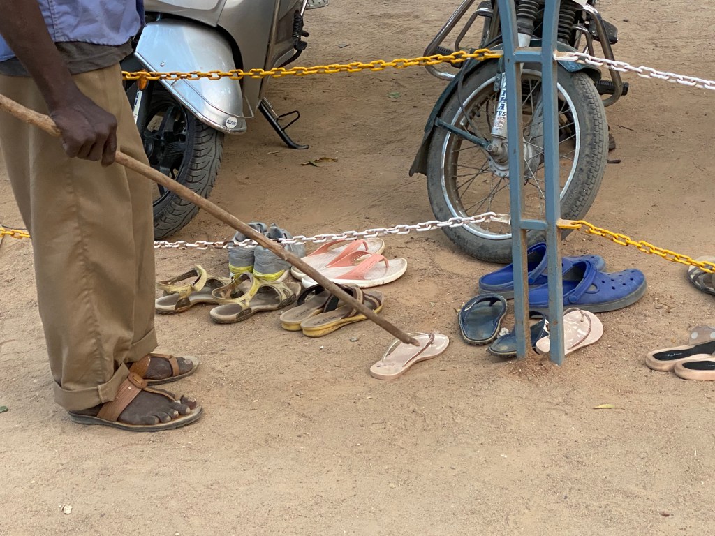 Llegamos al ashram y lo primero que hicimos fue dejar los zapatos a la entrada. Se pueden dejar a la entrada del templo, junto a decenas de pares de zapatos -casi todos sandalias- a riesgo de que alguien se enamore de ellos. También está la opción, muy económica, de dejarlos a cargo de un Shoe Keeper. Los zapatos NO ENTRAN, ni siquiera guardados en una bolsa o escondidos en una mochila.