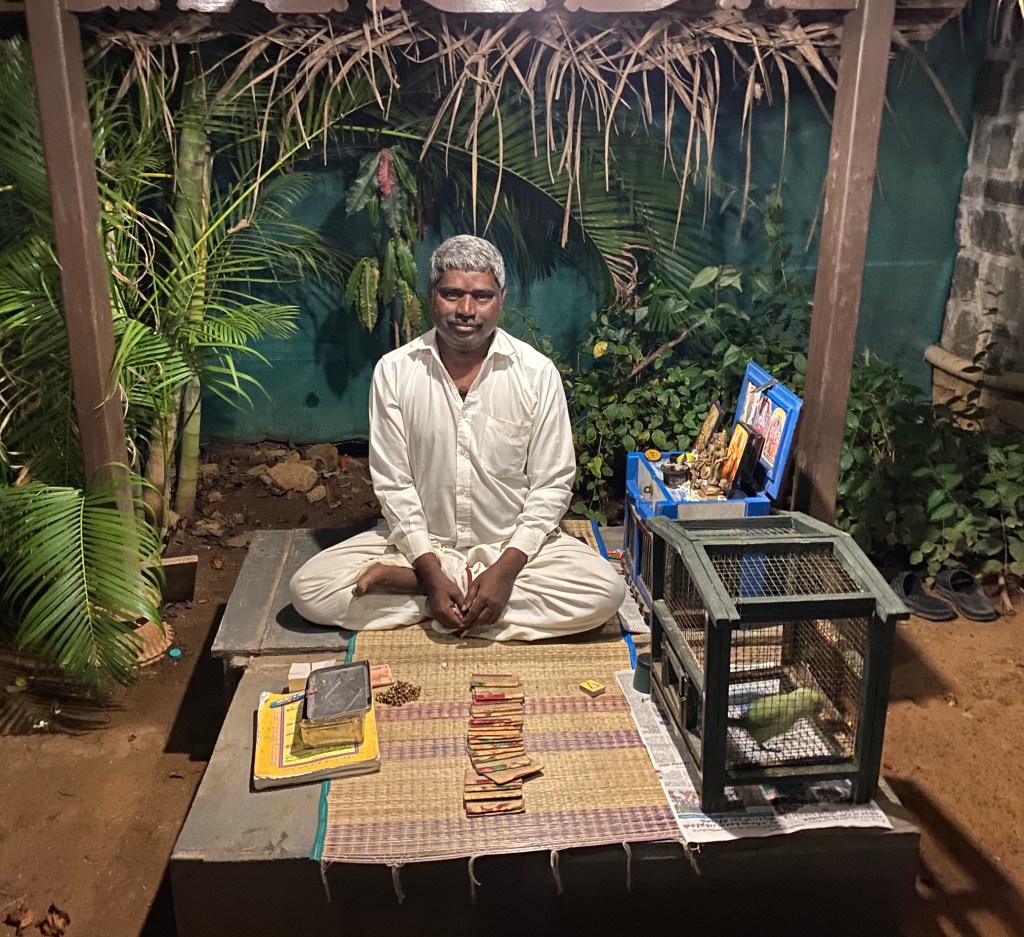 En el hotel hay un astrólogo de planta que está allí todas las noches. Esa noche, después de cenar me hice la consulta. El tipo de adivinación se llama Kili Josiyam que quiere decir “Horóscopo del Lorito” y es tal cual. Hay un lorito en una jaula, el astrólogo despliega un grupo de cartas sobre la mesa y le abre la puerta al lorito. Acto seguido, el lorito escoge una de las cartas, esa es la que tiene la “llave de mi futuro”. El dueño del lorito pasa a interpretar.