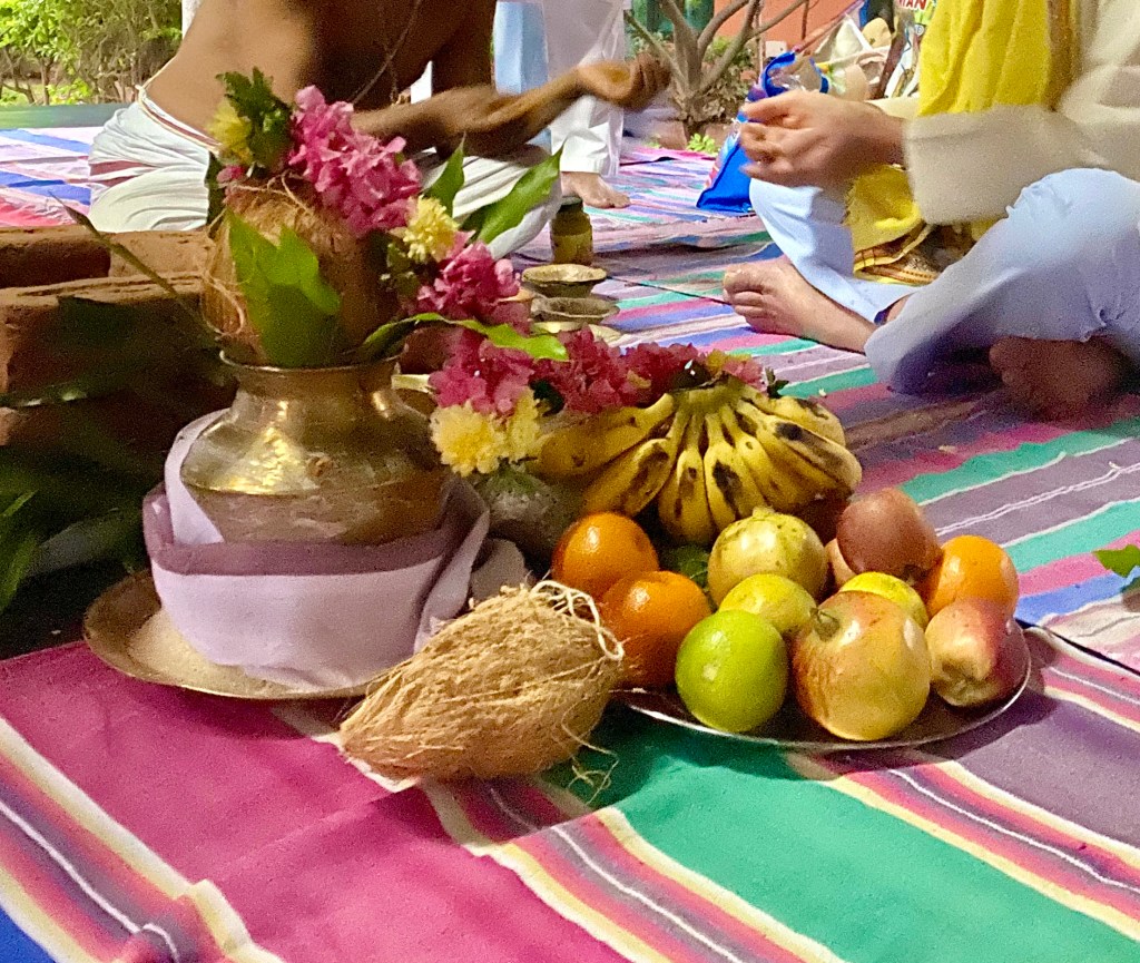 Junto al lugar para la fogata, había un recipiente de cobre, tipo florero, en el cual colocaron arroz y luego agua. Lo adornaron con hojas, le colocaron un coco encima, tapando el recipiente y remataron el arreglo con una guirnalda de flores. Al lado había una bandeja redonda con frutas, naranjas, granadas, manzanas, cambures (banano). También habían varios recipientes pequeños de bronce en los cuales estaban distintos elementos para la ceremonia como cenizas, y pastas de sándalo y bermellón.
