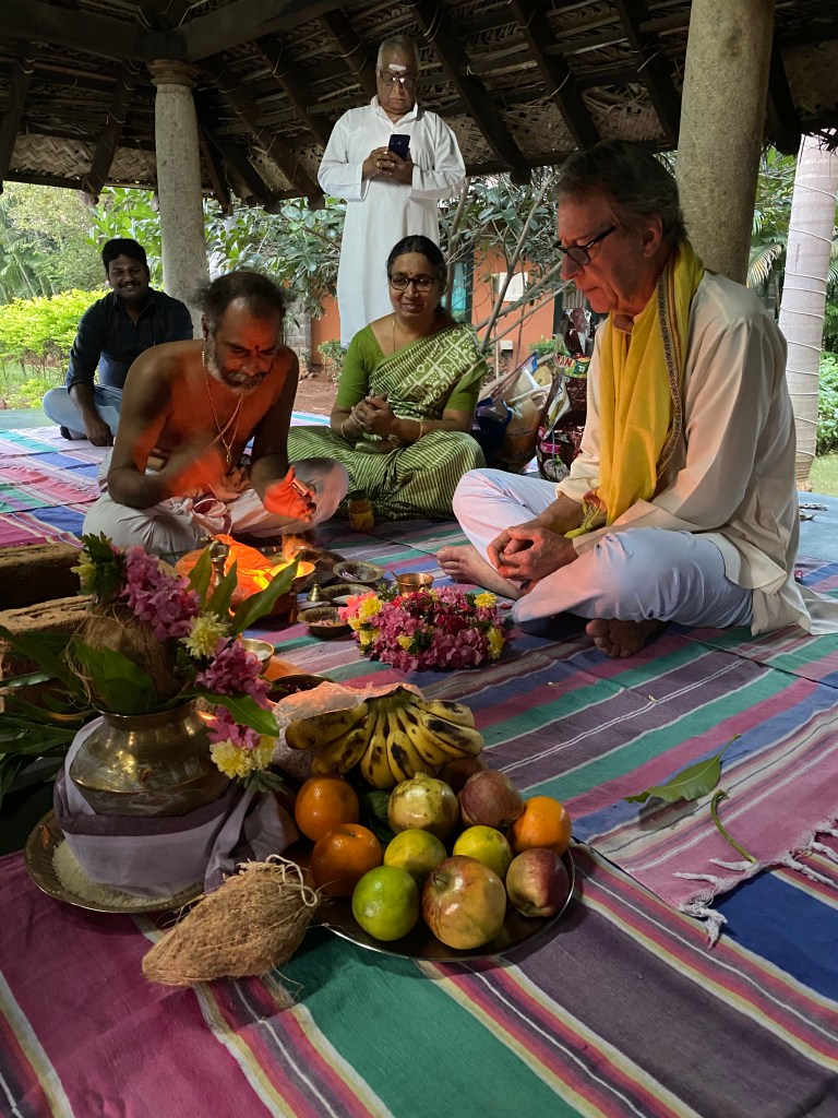 El sacerdote invitó a Roger a sentarse junto con él muy cerca del vedi. Hubo unos instantes de dedicación de la ceremonia. Nosotras nos sentamos alrededor sobre tapetes de colores. Mallika también estaba cerca para ayudar a traducir y explicar. Mallika sabe mucho y es una maravilla explicando. Durante unos minutos hubo pequeños ritos entre ellos y en un cierto momento se le unió otro sacerdote.