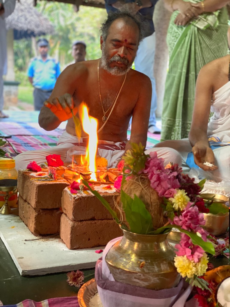 A continuación, encendió un fuego en un recipiente pequeño, hubo cantos y finalmente llevó el fuego al vedi. Poco a poco subió una llama hermosa y entonces, de manera coordinada, los dos sacerdotes procedieron a hacer las ofrendas intercalando semillas y rociando el fuego con la pasta de sándalo, utilizando para eso una hoja larga a la que previamente le dio forma.