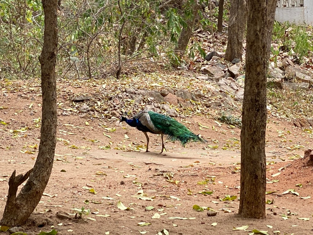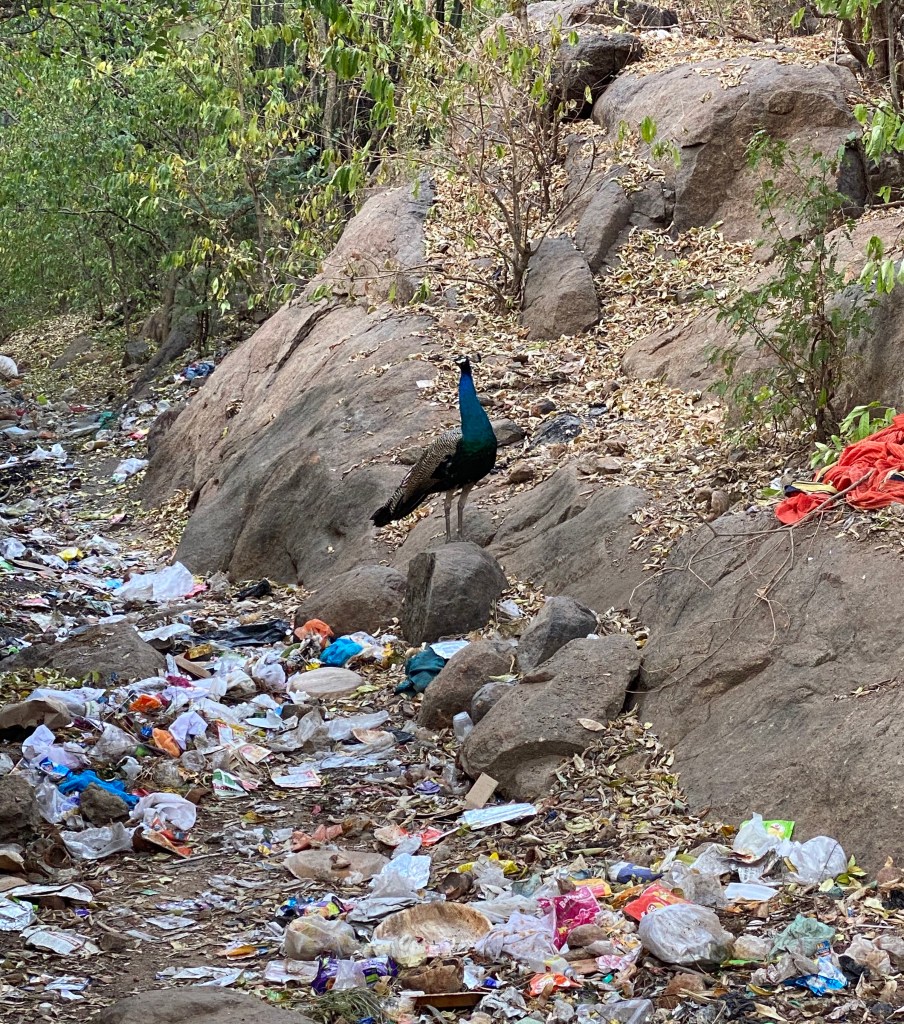 Lo primero que encontré fue una escena un tanto contradictoria, un pavo real en medio de una cantidad de basura. El pavo real es originario de India, el ave nacional y en Tamil Nadú se lo encuentra con frecuencia. Mas adelante había un aviso pidiendo colaboración para recoger la basura y llevarla fuera de la montaña. El mensaje terminaba con esta frase: