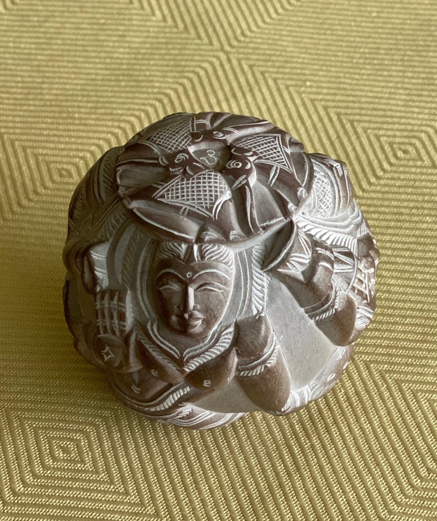 La bola tiene 3 figuras y el tallador me explicó un poco su significado: en un cara está Ganesh quien remueve los obstáculos; en la otra Shiva quien entre muchas cosas activa los chakras y apoya en la meditación y finalmente Shakti quien da poder. En la parte superior hay tres elefantes unidos unos a otros simbolizando que el alma nunca muere y en la parte inferior hay una flor que representa lo sagrado. Pensé que, más allá de que estéticamente me llamara la atención el objeto, las energías detrás de las representaciones eran todas positivas y bienvenidas en una meditación.
