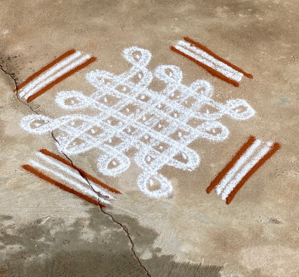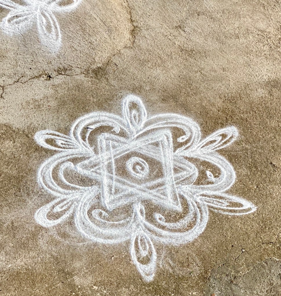 LO QUE APRENDI: El Kolam es básicamente un signo de invitación, dándole la bienvenida a todos en nuestra casa, y de manera especial a Mahalakshmi, diosa de la abundancia. Esta representación de Lakshmi vuela sobre las ciudades cada mañana y cada tarde y observa las entradas de las casas. Aquellas que están limpias y bellamente decoradas reciben su bendición.