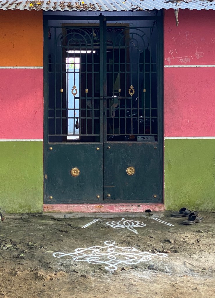 La otra cosa que llamó poderosamente mi atención fueron los diseños dibujados en el piso frente a las puertas de las casas y negocios. Pregunté a Ragú y me explicó que eso se llama Kolam