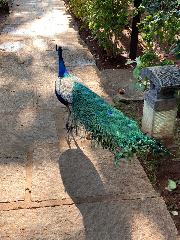 Luego de otro delicioso desayuno, abundante y variado, en el que seguí incursionando poco a poco en la cocina de Tamil Nadú, nos dirigimos a los jardines del resort, a una zona al lado del lugar donde habíamos asistido a la ceremonia del fuego el día anterior. Ahora íbamos a participar en otro tipo de ceremonia, un puja a Ganesh. Mientras caminaba hacia el lugar de reunión, un pavo real decidió acompañarme.