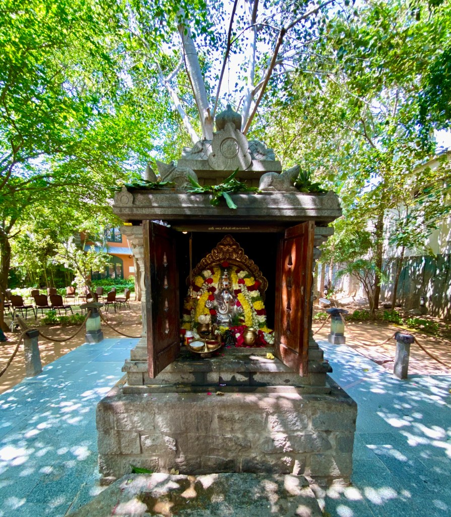 Una vez que tenemos una idea de a quien íbamos a dedicar nuestra atención, regresemos a Sparsa, el resort en Tiruvannamalai. Allí, en medio de los jardines hay un monumento a Ganesh. El monumento es de piedra tallada, puede medir unos tres metros de alto. Tiene una base cuadrada y sobre ella hay una especie de capilla dentro de la cual se encuentra una estatua de Ganesh. La estatua es de piedra, oscura, brillante y tiene aproximadamente 50 centímetros de alto por 40 de ancho. A esa imagen estaba dedicada la ceremonia en la que íbamos a participar, la puja