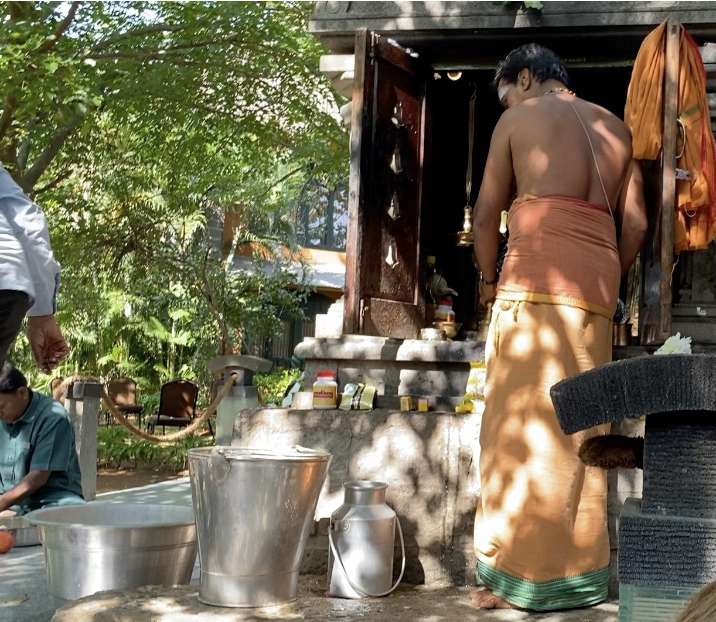 Primero tuvimos que lavarnos las manos con lo que entiendo era simplemente agua. Seguidamente el sacerdote empezó a bañar a la estatua mientras repetía mantras. Parte del mantra que cantaba me sonó parecido al chant que recito cuando entrego el mantra personal en la instrucción de Meditación del Sonido Primordial. Es un mantra de paz.