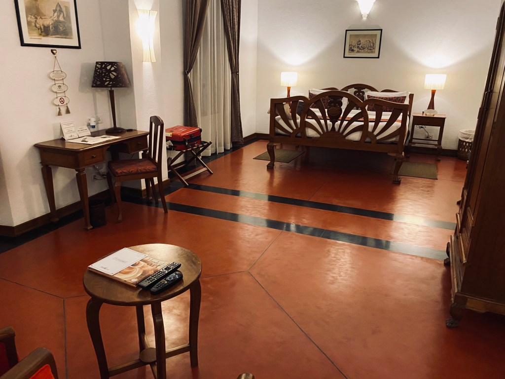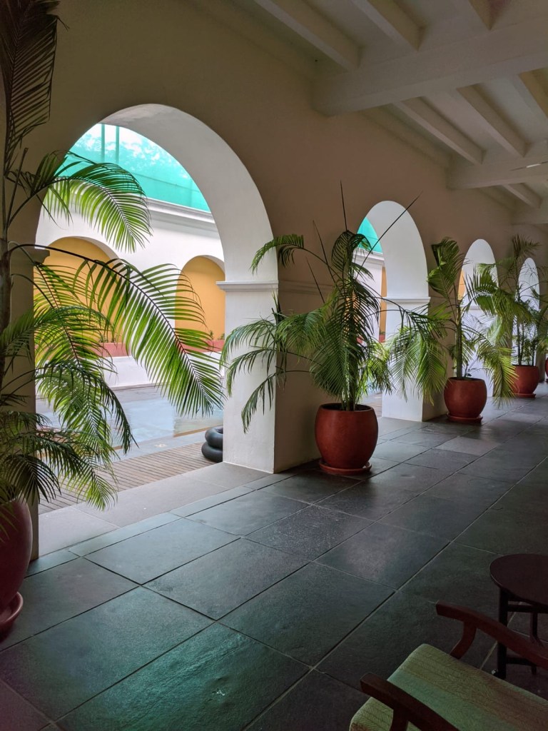 Dimos unas cuantas vueltas por la ciudad antes de llegar a nuestro hotel, Hotel Palais de Mande, Nos recibieron con guirnaldas de flores blancas y una bebida refrescante con chia. Esta vez recibí mi llave pronto y me tocó una habitación hermosa, grandísima, en la planta baja frente a la piscina. El hotel se asemeja a una mansión francesa, con techos muy altos, pasillos y balcones. El mobiliario y el ambiente en general tuvieron el efecto de hacerme sentir en otra época.