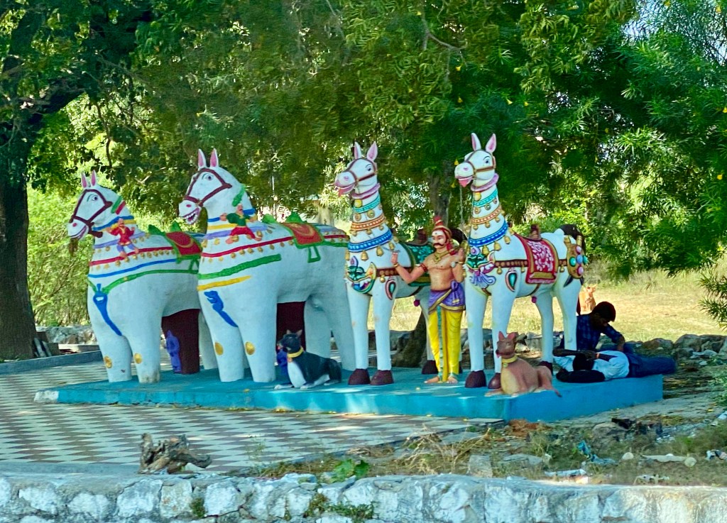 Paramos brevemente en el Templo de Ayyanar, una deidad rural muy popular en el sur de la India. Ayyanar cuida cada pueblo, sus cosechas y sus animales y por eso sus capillas o templos normalmente están en las afueras de los pueblos y son al aire libre.
