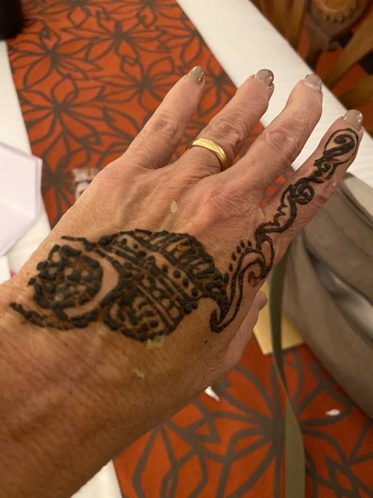 Mallika nos tenía una sorpresa. Había organizado para que, quienes quisieran, se hicieran un tatuaje de henna en la mano. ¡Por supuesto que quisimos!. Algunas se lo hicieron antes de cenar a mi me tocó esperar hasta después. Era la primera vez que me hacía un tatuaje.