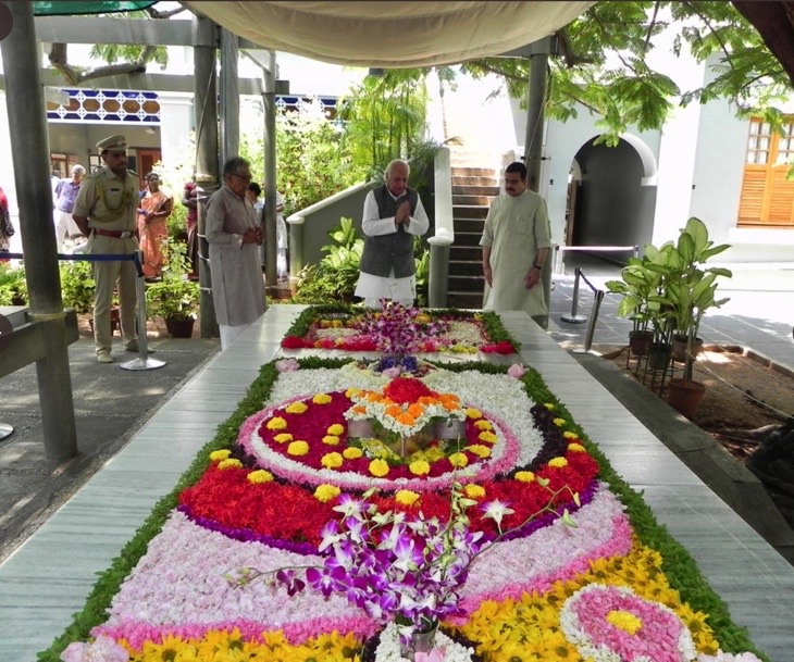 En la foto de la derecha aparece el Primer Ministro Narendra Modi en una visita realizada en 2018. Aproveché la reseña de The Hindu, para enterarme de otras áreas del ashram dignas de visitarse. Modi fue invitado a meditar en la habitación donde Aurobindo meditaba, cosa que hizo por 10 minutos. También visitó El Centro Internacional de Educación Sri Aurobindo, la escuela del ashram. Allí le mostraron como la escuela no sólo genera su propia energía solar a través de paneles solares (es la primera escuela en India totalmente autosuficiente en ese aspecto), sino que sólo utiliza 1/3 de la energía que produce y el resto es compartido en la red eléctrica.
