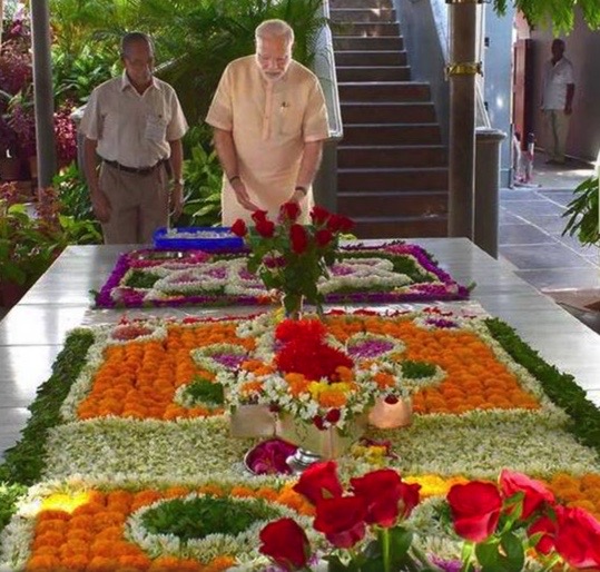 La foto de la izquierda la compartió Amit Shah, el Union Home MInister, -equivalente al Ministerio de Asuntos Internos- en su cuenta de twitter. Lo muestra mientras presenta sus respetos ante el Samadhi.