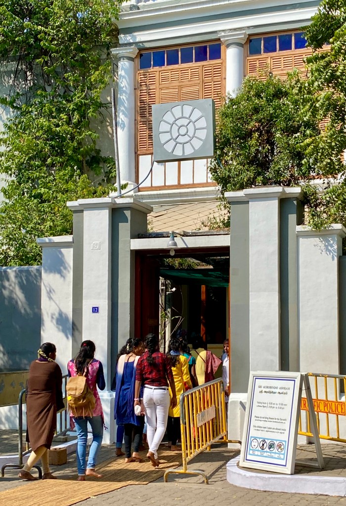 El ashram de Sri Aurobindo es uno de los más famosos de la India. Antes de entrar, nos explicaron Ragú y Roger que, a diferencia del ashram de Sri Ramana que habíamos visitado en Tiruvannamalai, en este ashram estaba prohibido tomar fotos y se requería permanecer en silencio durante la visita. Nos comentaron que los seguidores de Aurobindo eran muy celosos del lugar y vigilaban continuamente de manera estricta, cosa que pronto pudimos comprobar. Estábamos visitando el lugar para honrar a Aurobindo y a La Madre quienes se encuentran enterrados en el patio de esa edificación y para meditar en ese lugar.