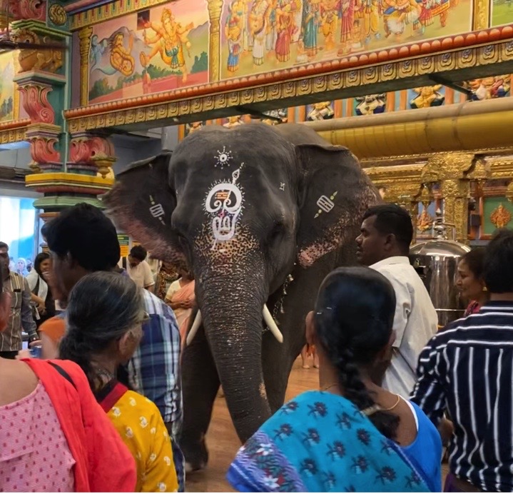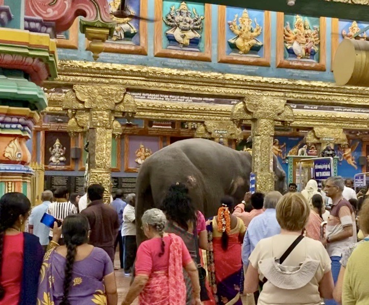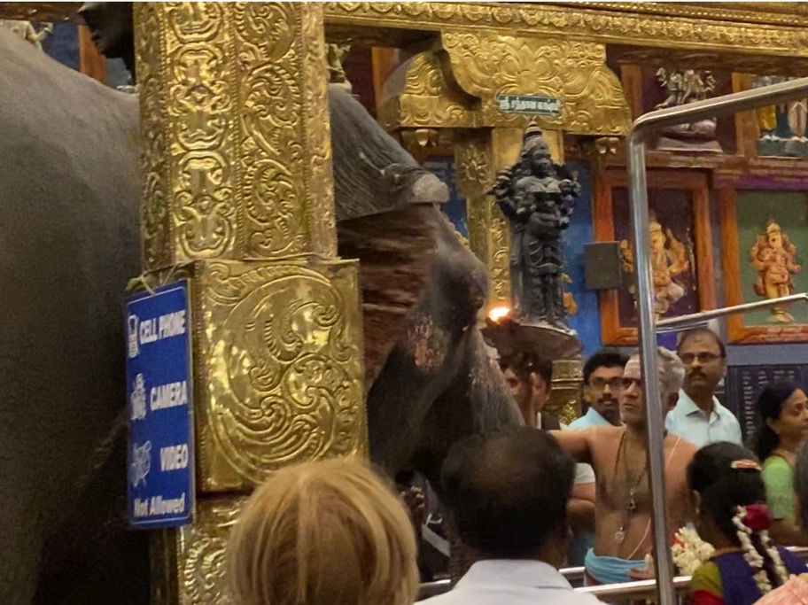 El elefante estaba entrando lenta y majestuosamente, y lo vimos dirigirse hacia la zona donde estaba la fila de Archanay. Allí, un sacerdote le dio una bendición, pasando un candelabro por encima de la trompa y poniéndole cenizas y pastas en ella. Una vez finalizado el pequeño ritual, el elefante retrocedió unos pasos y con mucho cuidado salió de esa fila. Lentamente se dirigió hacia el fondo, haciendo sonar las múltiples campanitas que llevaba en una cadena que colgaba de su cuello. Se presentó ante el sacerdote que nos había dado las cenizas hacía unos minutos y de nuevo recibió bendiciones. Después de esto, dio la vuelta y guiado por su dueño salió del templo.