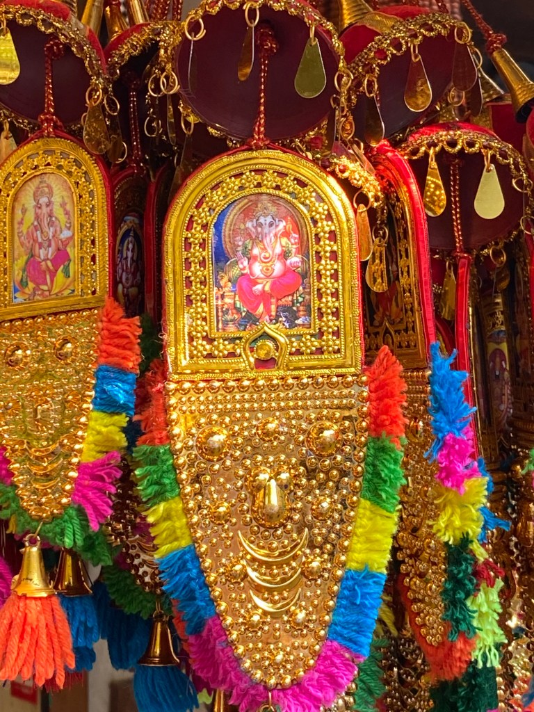 Mientras esperábamos a que abrieran el templo, nos entretuvimos tratando de curiosear las mercancías. solo pudimos ver, casi todos los dueños de los negocios estaban en su hora de descanso. Había collares, malas, adornos e infinidad de modelos de Ganesh expuestos en los pequeños negocios. También vendían unas flores bellísimas y unas cestas o recipientes pequeños arreglados con flores y frutas. Nos dijeron que esas eran para las ofrendas y que se llamaban Prasad.
