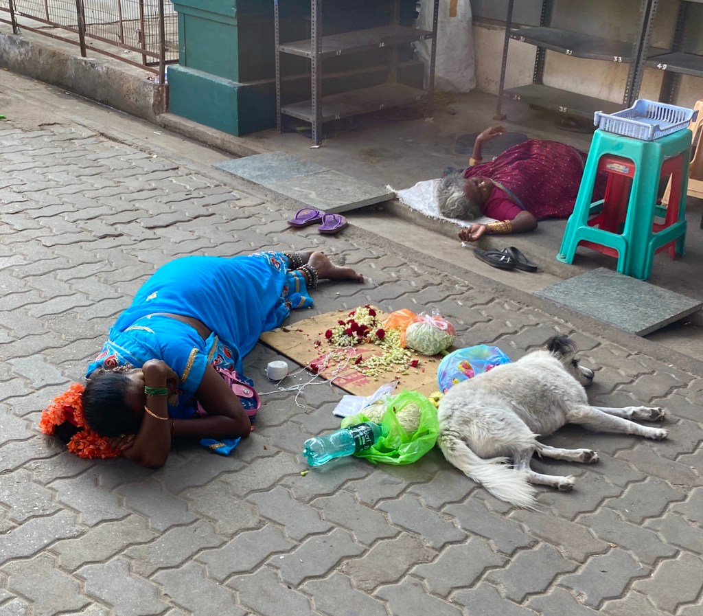 Del ashram nos fuimos directamente al Templo Arulmigu Manakula Vinayagar, quedan muy cerca. Al parecer habíamos llegado muy temprano. El templo estaba cerrado y la gente que trabaja en las pequeñas tiendas que lo rodean estaban, en su mayoría, durmiendo la siesta. Algunos de ellos dormían en la calle, en plena acera. Ningún problema, el perro también dormía.