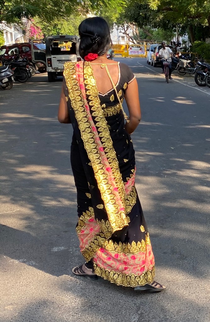 Entre los vendedores que se acercaron estaba una joven que vendía un aparatico muy ingenioso. Era una especie de rodillo con agujeros. El rodillo estaba lleno de un polvo, posiblemente tiza, y al rodarlo sobre la superficie de la calle dejaba un diseño. Había variedad de diseños y de colores. Me imaginé que los usaban como complemento a los Kolam, los adornos frente a las puertas de las casas que comenté en Tiruvannamalai.
