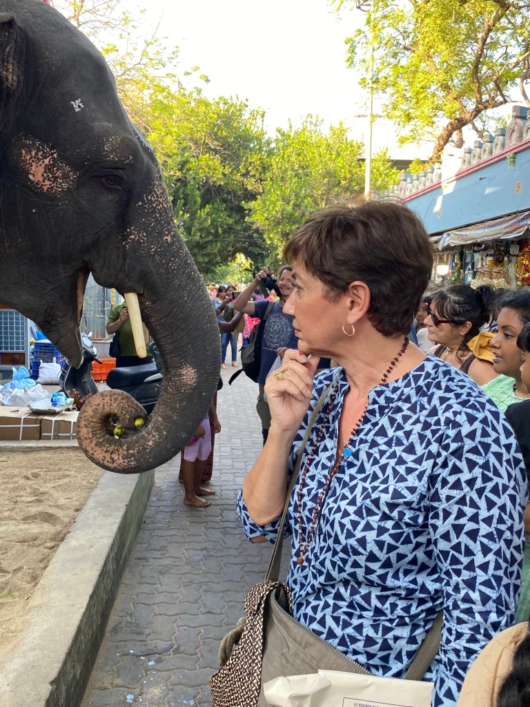 Afuera todo el mundo quería acercarse a Lakshmi. Esperamos turno para aproximarnos y fotografiarnos con ella. Mas tarde me enteré de que los devotos ponen una moneda en la palma de la mano, ella toma la moneda con la trompa, suavemente pone la trompa sobre la cabeza del devoto para bendecirlo y luego le da la moneda a su dueño. Me perdí esa bendición, pero de cualquier manera fue muy hermosa la interacción con el elefante del templo.