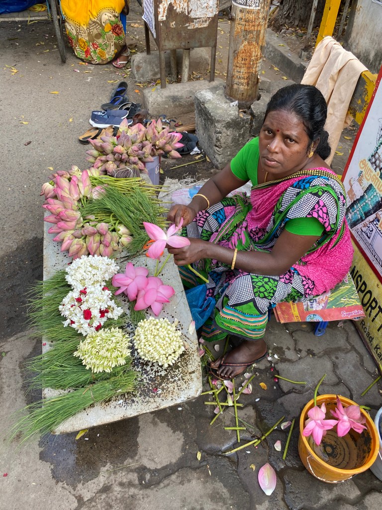 Pudimos ver la fila de personas que iban a hacer Archanay. Estas personas, todos hindúes, llevaban en sus manos las pequeñas ofrendas de flores y frutas o unos ramos de flores espectaculares como los que habíamos visto a la puerta del templo.