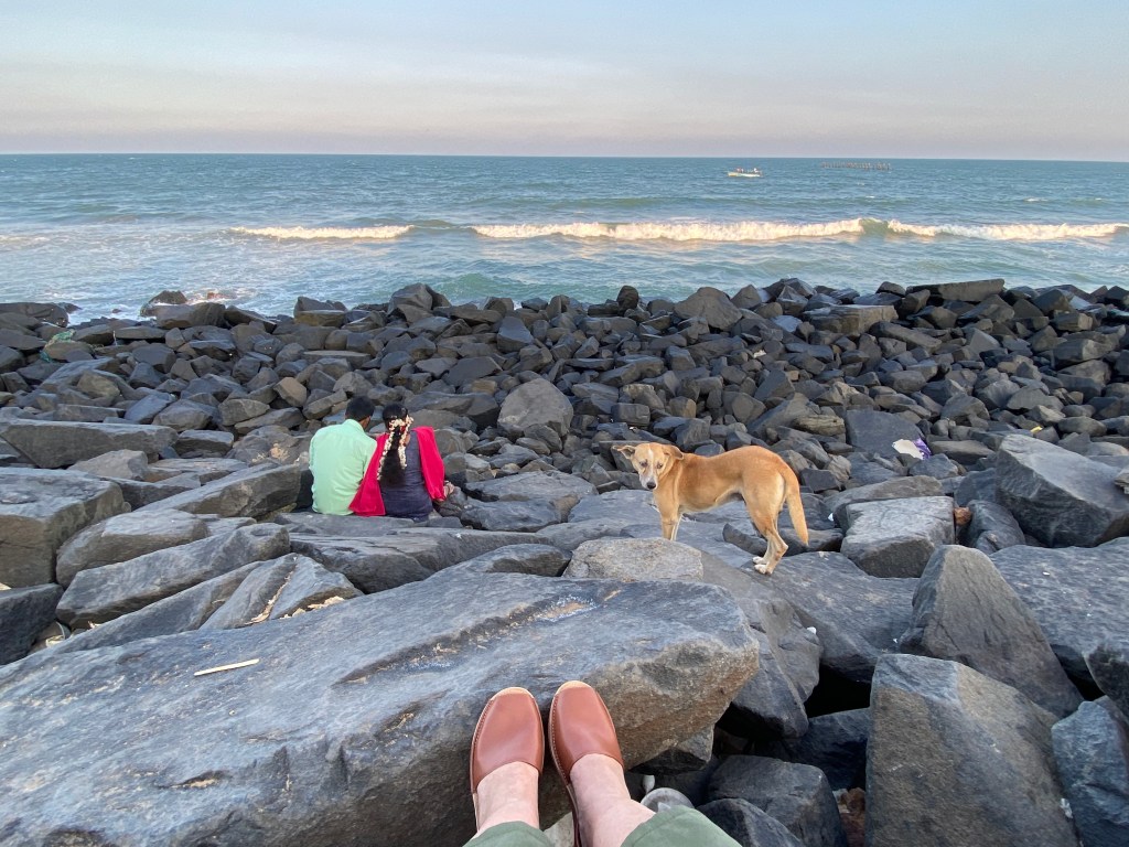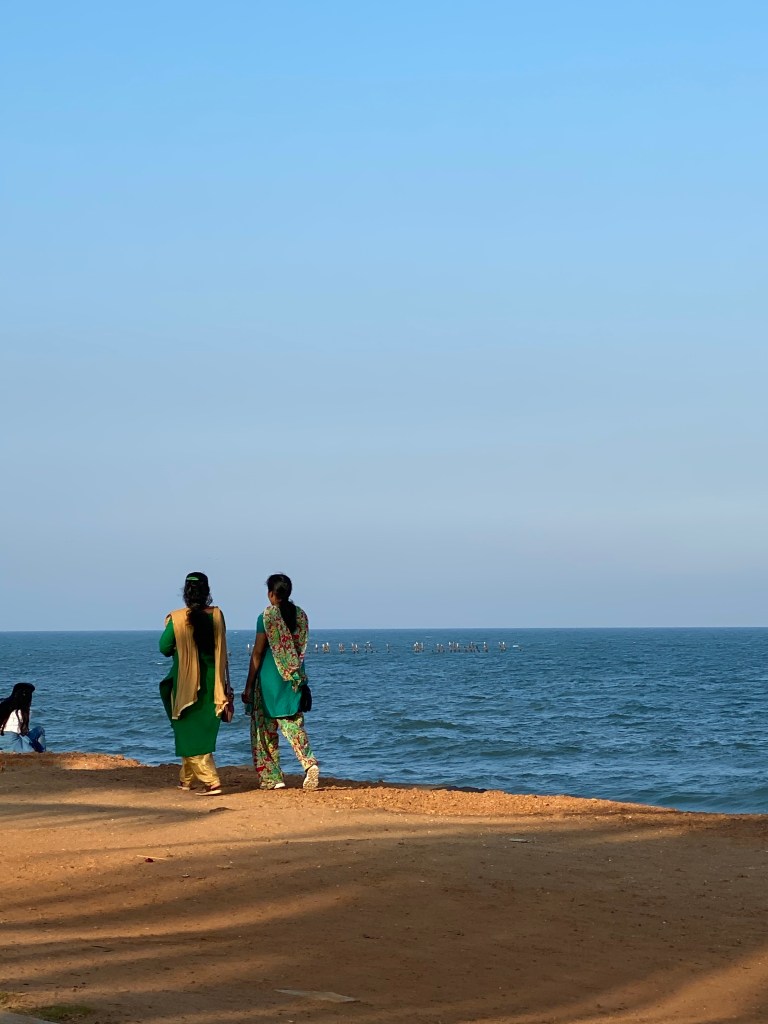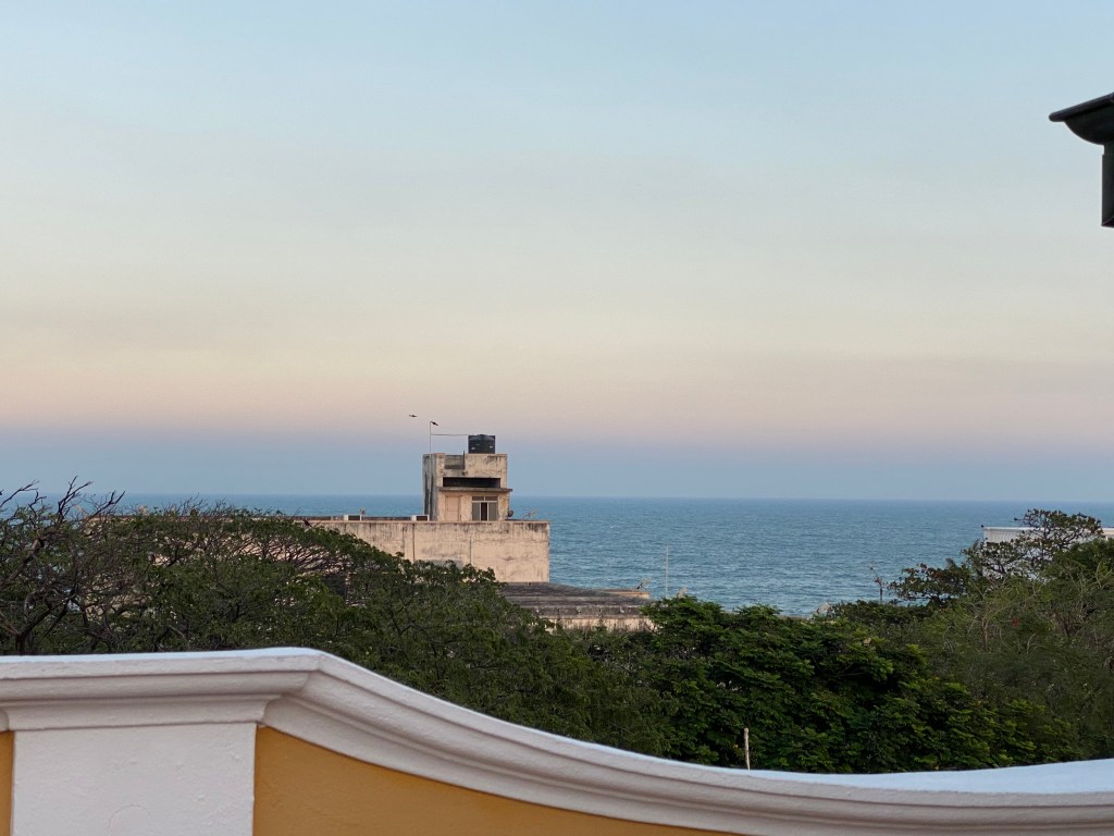 Llegamos temprano al hotel, teníamos un par de horas antes de la cena. Nos habían dicho que era una cena especial, 14 de febrero, Día de los Enamorados también en Puducherry. Algunas compañeras del grupo optaron por disfrutar de ese par de horas en la piscina; yo no tuve que pensarlo, prefería ir a caminar por Puducherry, disfrutar de la vista y la brisa del mar en el Paseo de la Playa. Salí del hotel, caminé un par de cuadras y ya estaba frente al mar, frente a la Bahía de Bengala. Tiene un sonido tan exótico ¡Bahía de Bengala!
