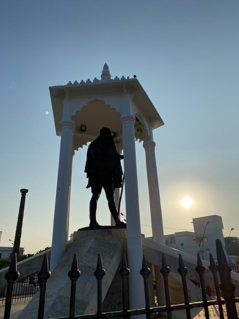 Me detuve para contemplar el monumento. La estatua de Gandhi era grande, pienso que tiene alrededor de 4 metros de alto y estaba protegida por una especie de gazebo alto de cinco columnas y pintado de blanco. La estatua era oscura y el contraste la hacía resaltar aun mas.