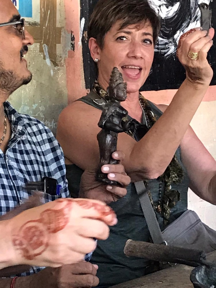 Me enamoré a primera vista de un Ganesh pequeño y estilizado. Menos mal que lo tomé de la repisa y seguí visitando la galería con él en la mano, -para angustia de mi pequeño guía- Pronto me di cuenta de que muchas personas se enamoraron también de mi pequeño Ganesh. Aquí lo tengo