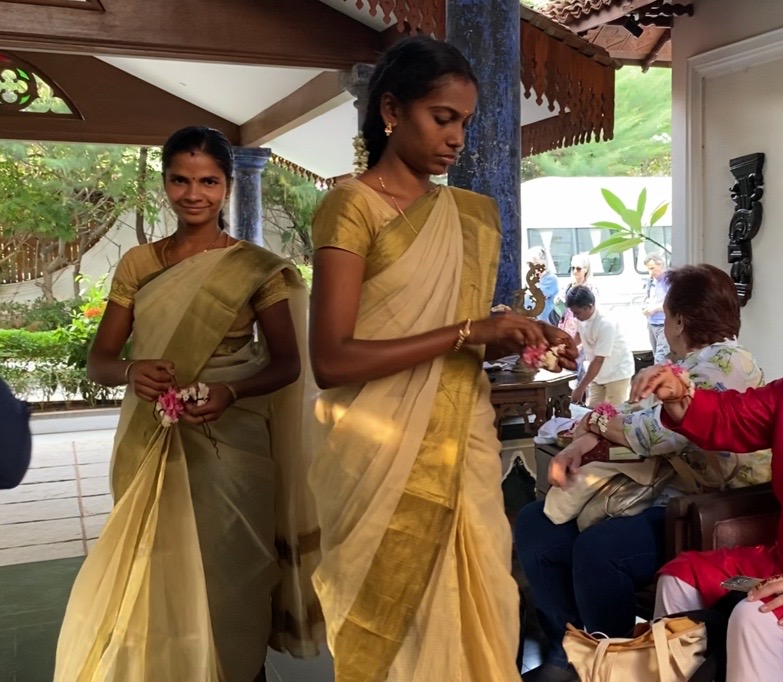 Nos esperaban con toallitas húmedas perfumadas para refrescarnos y mientras Mallika se ocupaba del registro del grupo, nos invitaron a sentarnos en unos bancos en el amplio lobby abierto a los jardines. Allí, dos jóvenes trajeadas con saris dorados fueron colocando en la muñeca de cada una de nosotras, unos hermosos brazaletes elaborados con jazmín y otras flores. En el centro del lobby, un cuenco de piedra decorado con capullos de jazmín decoraba y perfumaba el ambiente.