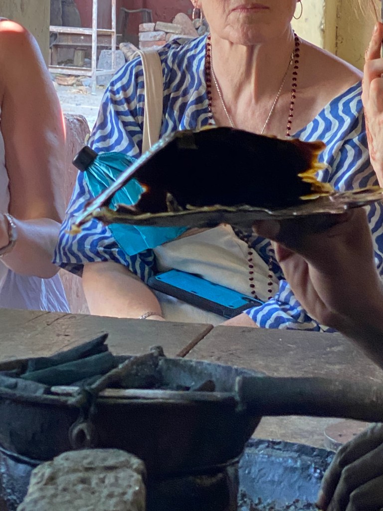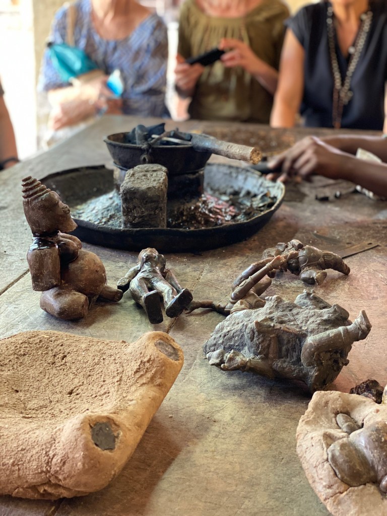 - Se moldea la figura a mano, con ayuda de algunas herramientas y lo más importante calor. En nuestro caso había un pequeño caldero con fuego en medio de la mesa. (Mientras el maestro siguió hablándonos del proceso, el estudiante empezó a moldear una mano pequeña). Moldear una pieza toma al menos 5 días, por supuesto varía con el tamaño de la figura.