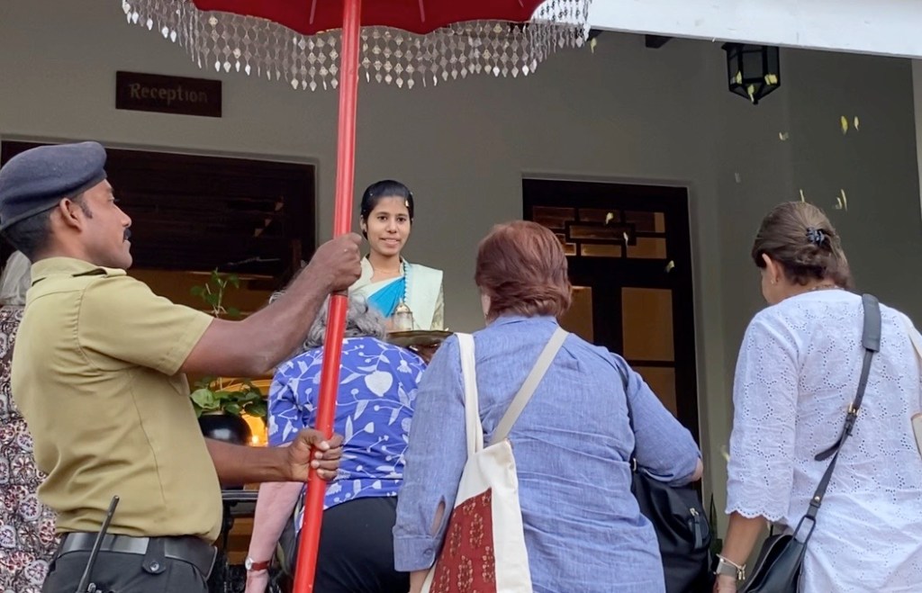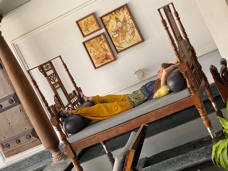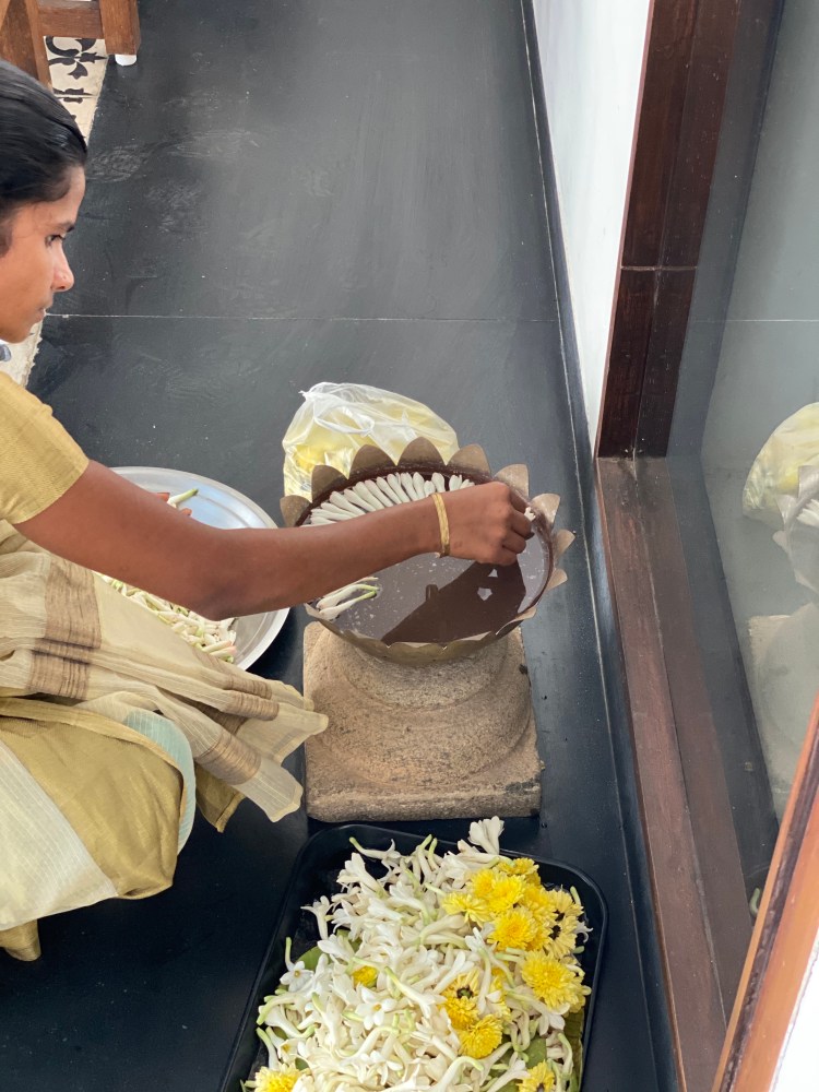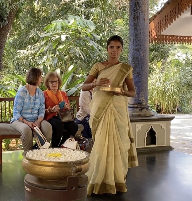 Subimos a las habitaciones para entregar las maletas. Esa tarde salíamos rumbo a Madurai. Mientras esperábamos en el lobby al aire libre, una de las señoritas que nos habían recibido el día anterior con brazaletes de jazmín, se acercó a cada una de nosotras con una bandejita que tenía una llama y el polvo rojo para despedirnos con una bendición. A cada una le colocó un punto rojo en la frente.