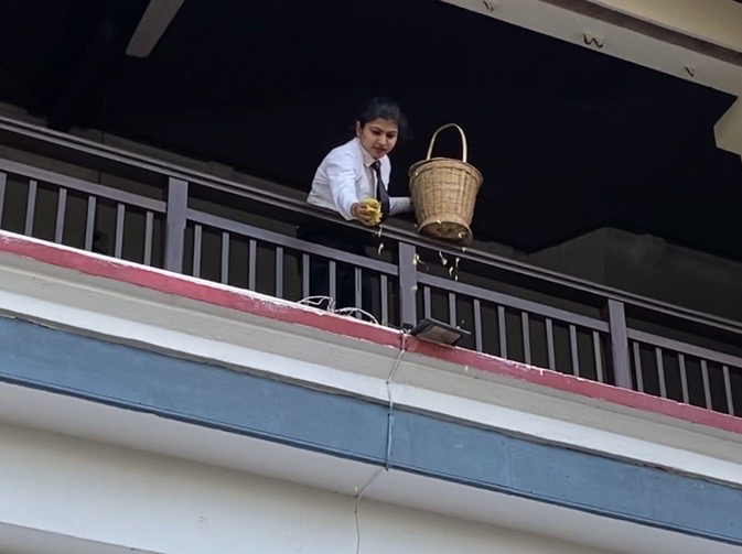Finalmente llegamos al hotel. Estábamos un poco cansadas, el viaje había sido largo. Cuando nos acercamos a la entrada del edificio, nos esperaba una bienvenida muy original. Mientras sonaba música de campanas y tambores, del segundo piso llovían sobre nuestras cabeza pétalos de flores. Un guardia nos protegía de la “lluvia” con un paraguas pequeño y muy elegante y una señorita, ataviada con un hermoso sari azul y dorado, nos esperaba al tope de las escaleras para recibirnos con una bendición en la forma de cenizas en nuestras frentes. ¡Qué bonito! Me encantó.