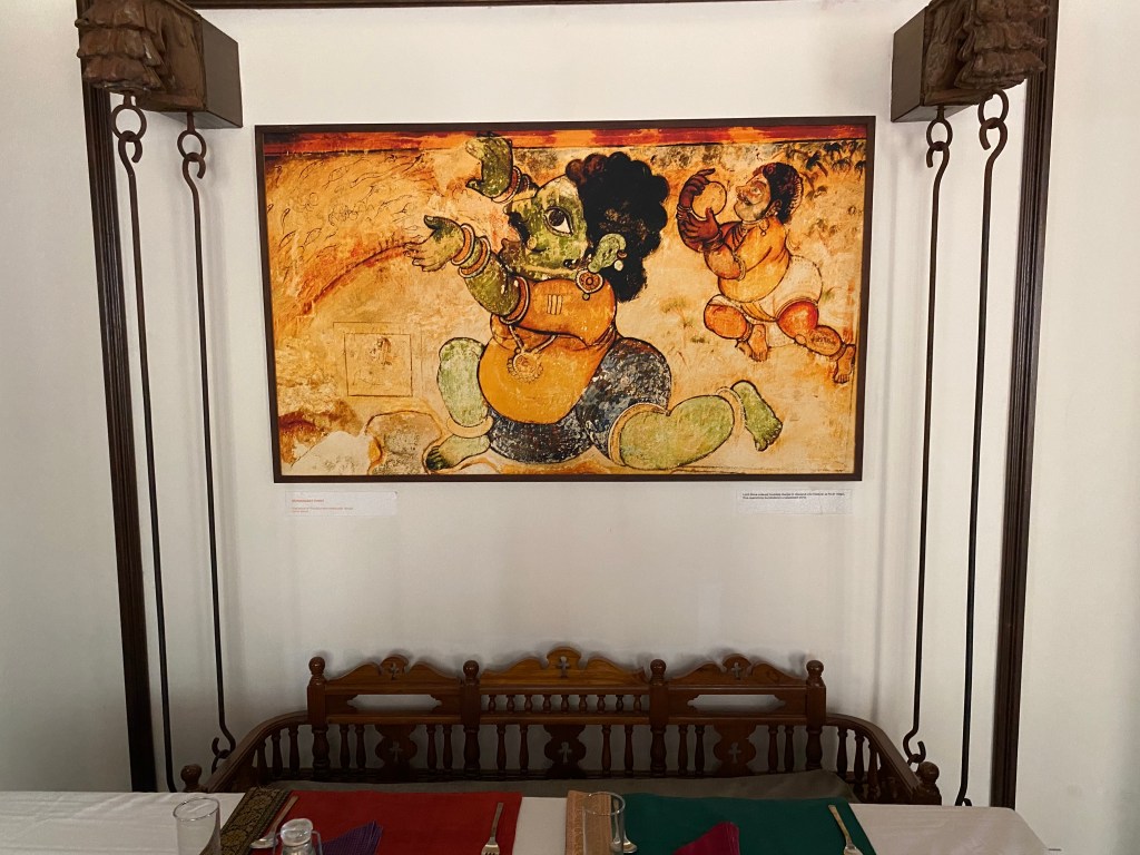 Pasamos a almorzar y busqué en el restaurant Aaharam la reproducción de los murales que había visto en el templo. Allí estaba, una imagen con fondo sepia con dos personajes. Me encantaba.