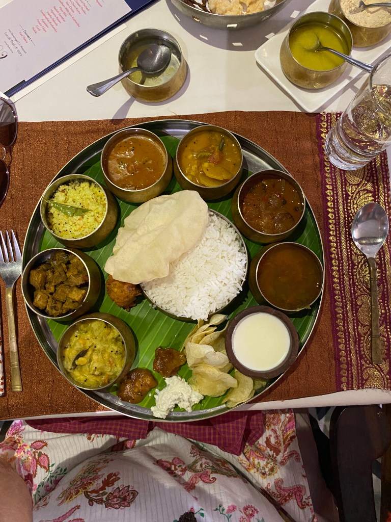 Después de la sopa, según el menú, íbamos a tener Thali. Estaba curiosa por la larga lista de platos que aparecían debajo de ese nombre y en la que abundaban palabras que no reconocía. Cada una de nosotras recibió una hermosa bandeja redonda de bronce, cubierta interiormente por una hoja, me imagino que de plátano. En el centro había un recipiente con arroz blanco el cual estaba rodeado por 8 recipientes más pequeños, cada uno con una preparación diferente. Había también en la bandeja 5 acompañantes mas, entre ellos papas fritas. Adicionalmente, tenía frente a mi un par de lo que creí eran salsas que podía agregar a la comida.