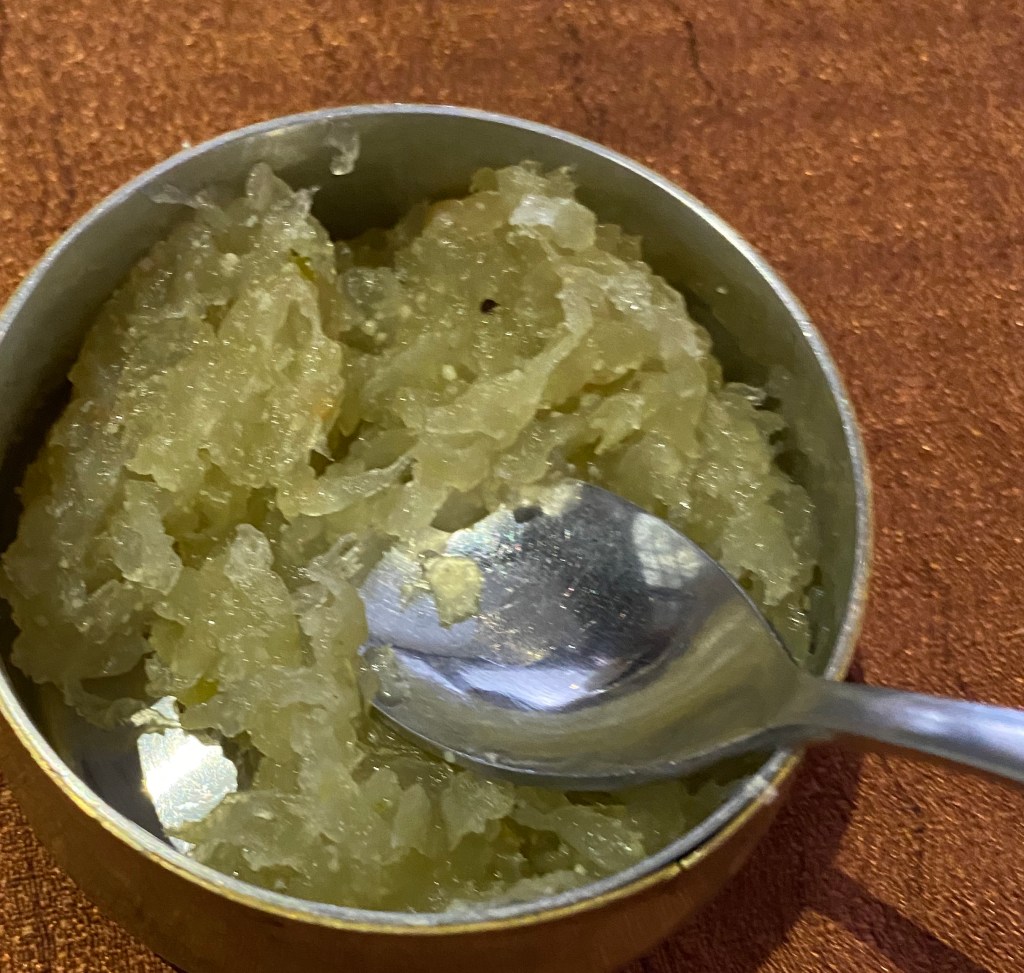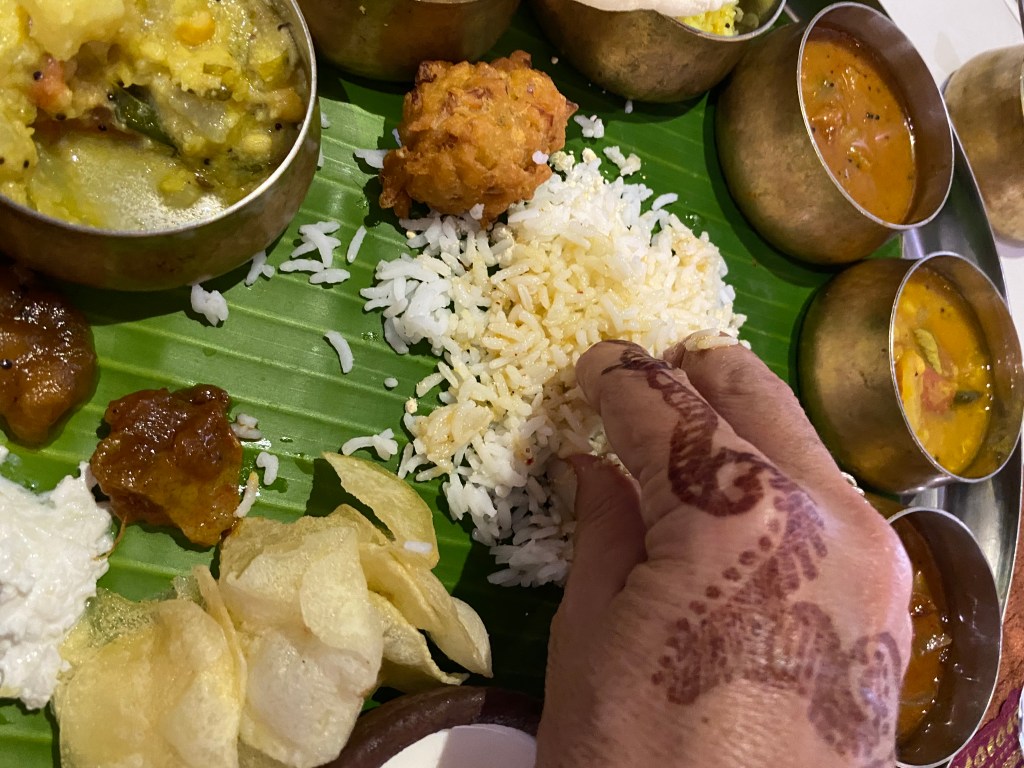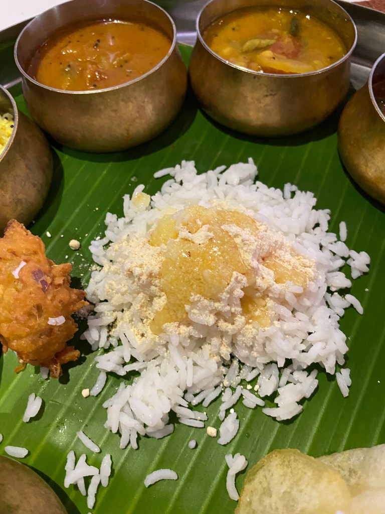 La primera indicación, servirme el arroz directamente en la hoja y agregarle un poquito de los dos recipientes que tenía enfrente. Uno era un polvo y el otro era ghee. Me preguntó Muthu, el mesero, si quería comer ese plato de la manera correcta. ¡Por supuesto! exclamé y él muy entusiasmado me dijo,” Tienes que comerlo con la mano”. Con el mismo entusiasmo acepté la sugerencia.