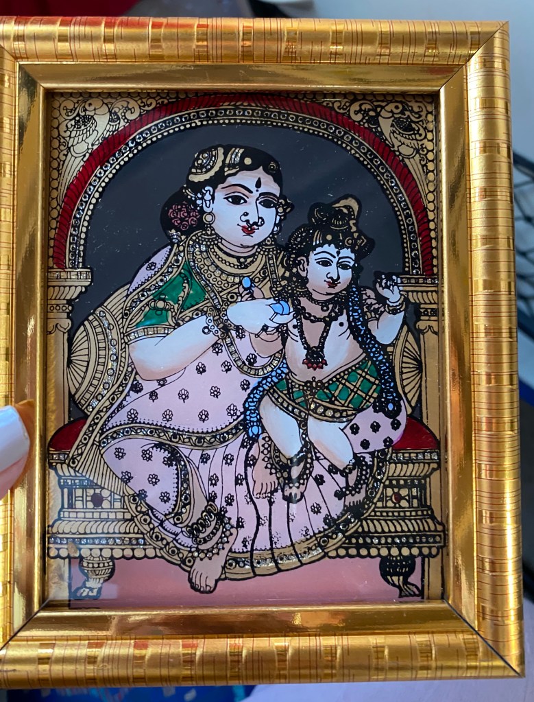 Elvira consiguió lo que buscaba y yo encontré lo que no buscaba. En la tienda, colgados de las paredes había unos cuadritos pequeños pintados de manera muy delicada que representaban deidades. Viéndolos de cerca me di cuenta de que estaban pintados sobre vidrio y tenían unos punticos o piedritas muy pequeñas que brillaban. Me fui enamorando de uno, y de otro… Terminé comprando 3 versiones de Ganesh y uno muy tierno de Shiva con su mamá.