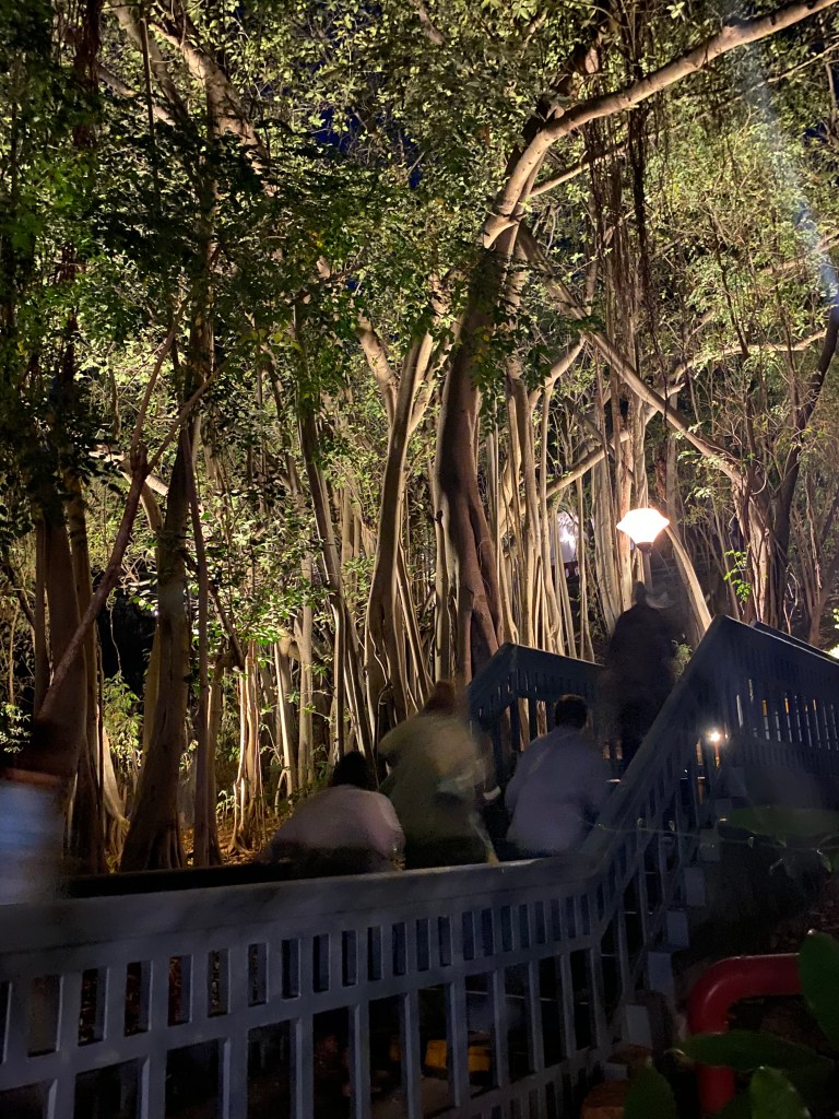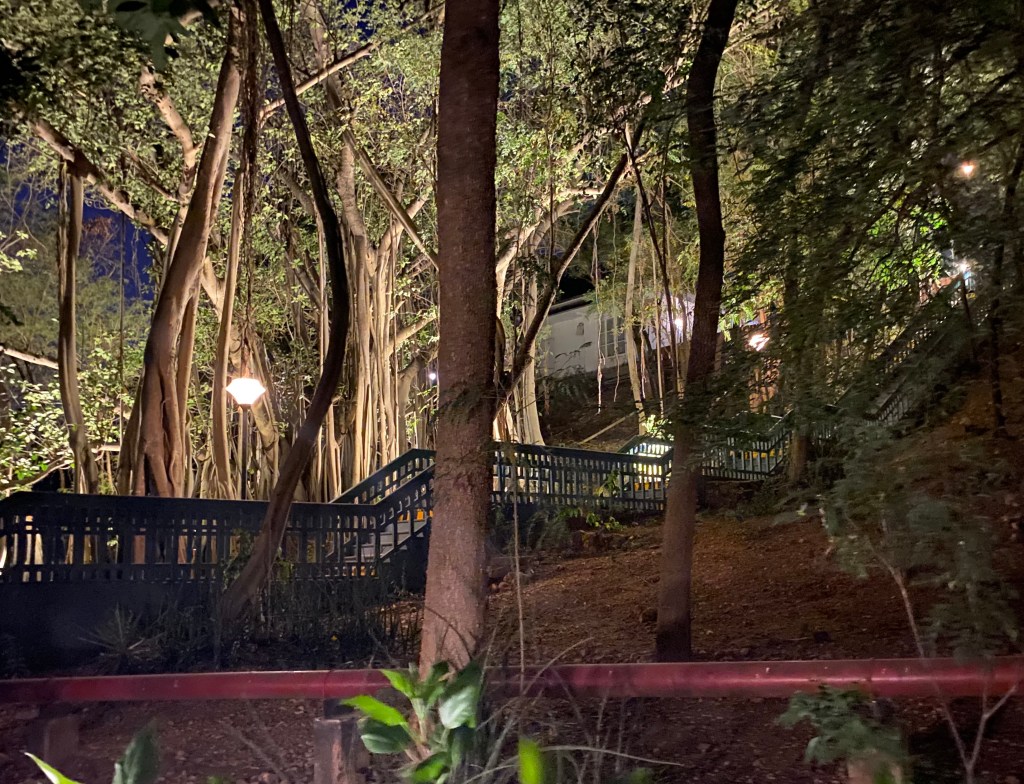 Meditamos cerca de la piscina, en un lugar con una vista muy linda sobre la ciudad. Allí también tuvimos la compañía de los mosquitos. Rápidamente llegó la hora de cenar y cuando salimos de las habitaciones para dirigirnos al restaurante ya estaba oscureciendo. Las escaleras que nos estaban esperando resultaron un espectáculo gracias a la iluminación del lugar. Eso nos hizo olvidarnos un poco de los escalones que restaban.