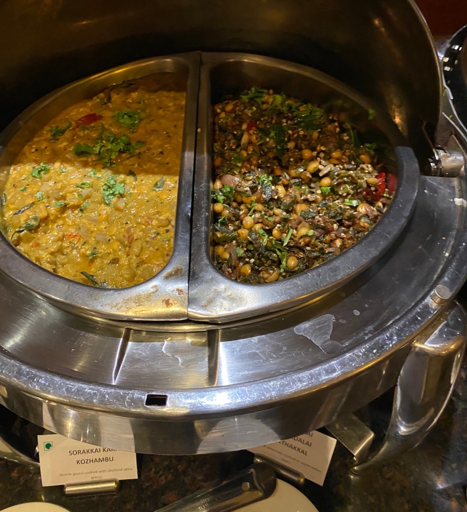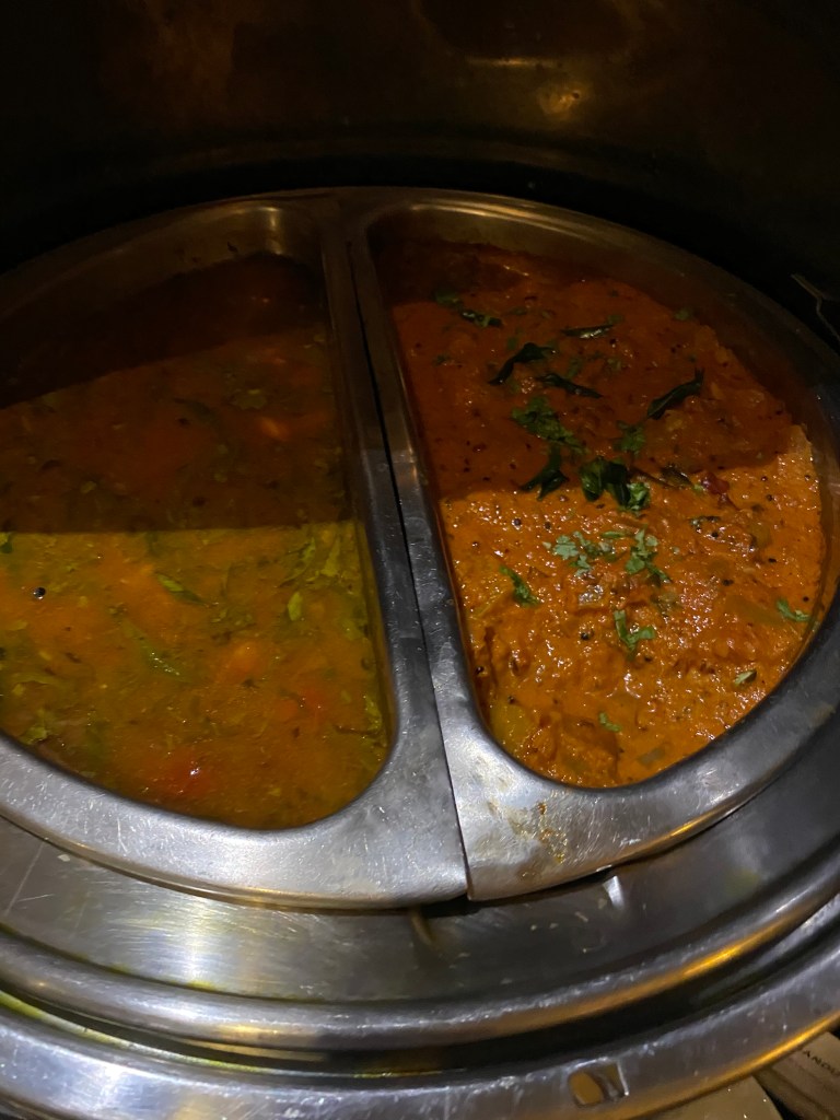 El primer recipiente de la izquierda en la foto, era Chow Chow Kootu, un guiso de lenteja con chayota típico de Tamil Nadu. Le seguía unas batatas muy condimentadas, muy ricas. También estaba el arroz con limón y varios guisos entre ellos Mysore Rasam, otro plato con lentejas como base, esta vez transformado con tomates, jugo de tamarindo, hojas de curry, cúrcuma y un sin fin de especies. Era dulce y estaba delicioso.