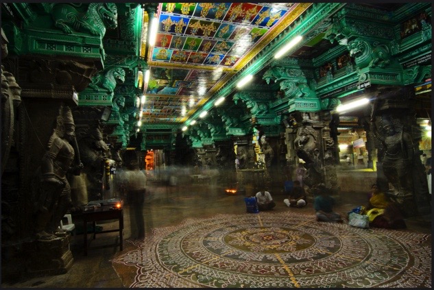Meditamos en el salón de las mil columnas, Ayirakkal Mandapan, un sitio espectacular. Las columnas presentaban tallas a cuál más atractiva y su distribución era tal, que desde cualquier ángulo que se las veía, estaban perfectamente alineadas. En uno de los pasillos de entrada había un mandala espectacular en el piso y gente sentada alrededor. Dentro del salón encontramos un museo de arte hindú con pinturas y esculturas. Nos comentaron que las columnas de la parte exterior producían un sonido musical cuando se las golpeaba suavemente.