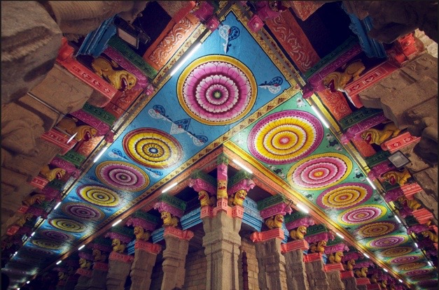 Entramos en un pasillo mucho más amplio que el anterior, con cuatro hileras de columnas de piedra, talladas de piso a techo, rematadas en capiteles todavía mas elaborados. En los capiteles empezaban los colores, algunos pintados en rosado, otros en verde y al seguir mirando hacia arriba los techos brindaban un espectáculo multicolor. En el techo de la parte central del pasillo, uno tras otro estaban una especie de medallones con la figura de Parvati en distintos colores. El techo en los pasillos laterales estaba adornado con mandalas multicolores.