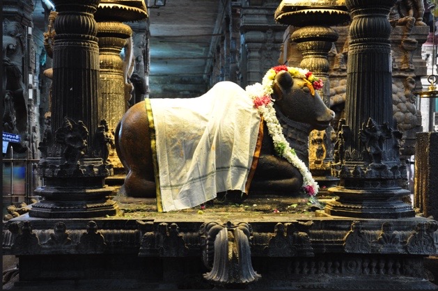 Frente al sanctum sanctorum de Shiva encontramos un gigantesco Nandi, no tan grande como el de el día anterior, pero si muy adornado. Tenía una tela sobre el lomo y guirnaldas de flores sobre la cabeza y alrededor del cuello. Esta figura también tenía muchas personas alrededor.