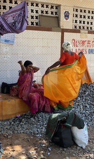 Llegó el momento de salir y tuvimos que caminar bastante hasta llegar a la puerta donde estaban nuestros zapatos. Los recuperamos sin ningún problema y enseguida apareció Sekar con los teléfonos. Mientras esperábamos instrucciones me di cuenta de que una señora que estaba a poca distancia estaba muy ocupada poniéndose su sari mientras otra se peinaba. Por un aviso que vi me pareció que cerca quedaban unos baños. Allí me quedé observándola medir y dar vuelta y volver a probar, y volver a medir… La tarea no era sencilla, definitivamente tomaba su tiempo y tenía una técnica.