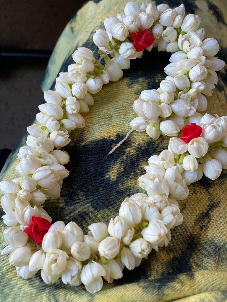 Cuando íbamos en el autobús, Mallika nos había regalado unos bellos adornos de flores para la cabeza y nos explicó que era tradicional que las mujeres los llevaran en las visitas a los templos. De una u otra manera casi todas logramos ponernos las flores en el cabello. Con mucha habilidad Elvira nos ayudó a unas cuantas. Mis flores duraron poco rato allí, no había mucho de donde agarrarse…