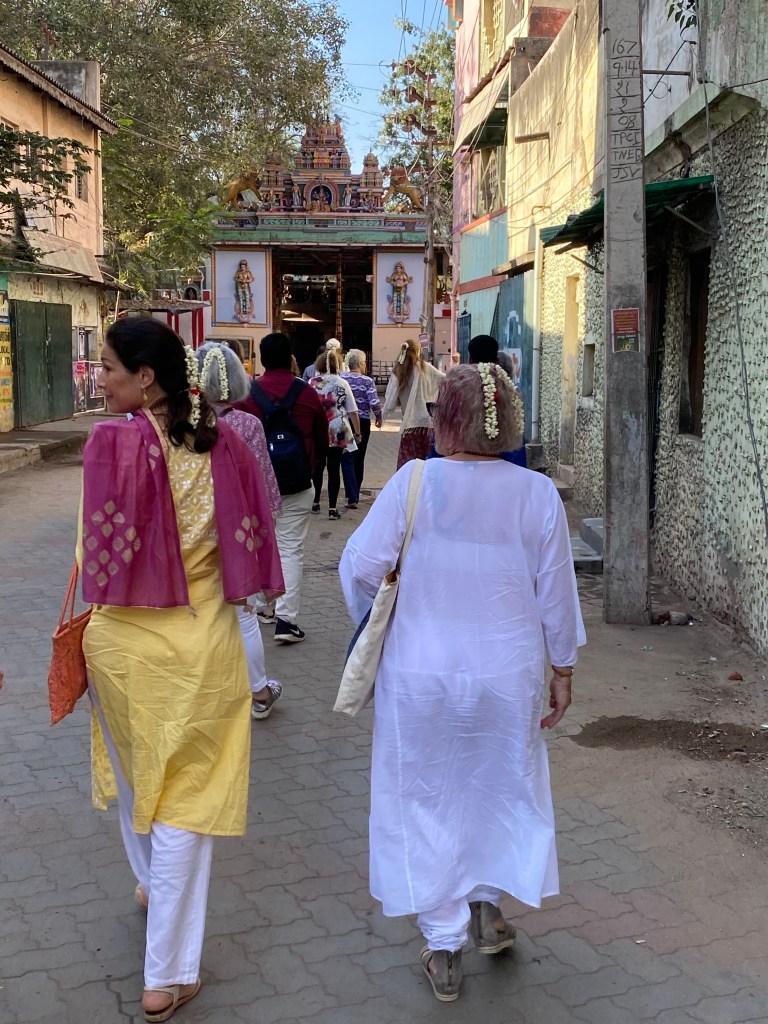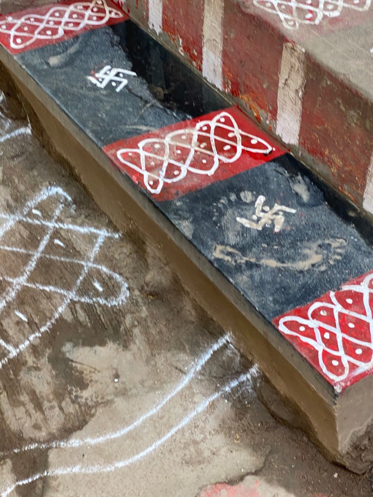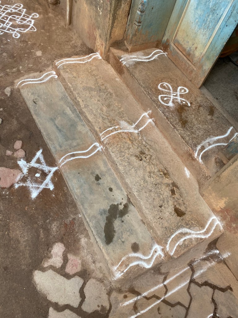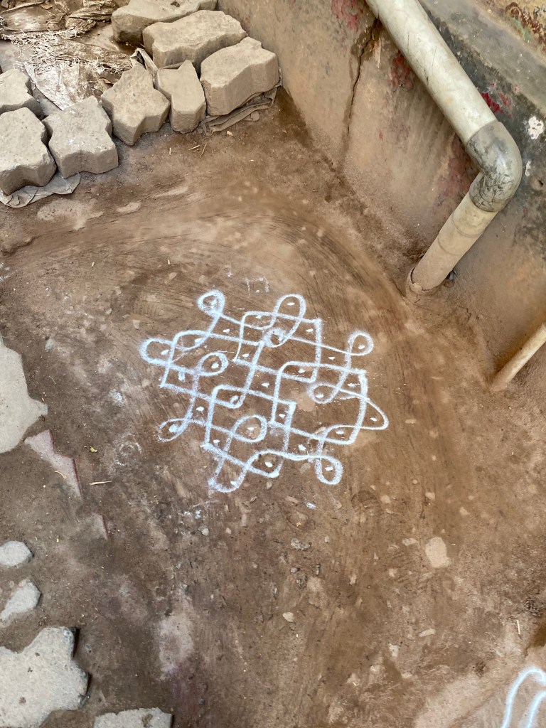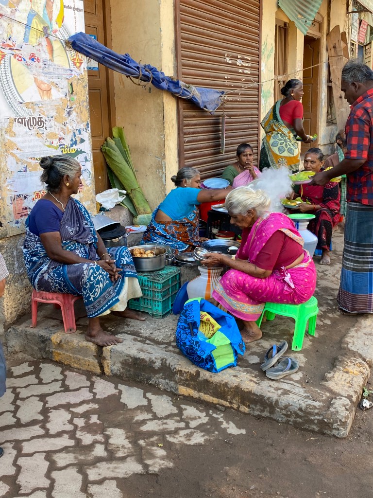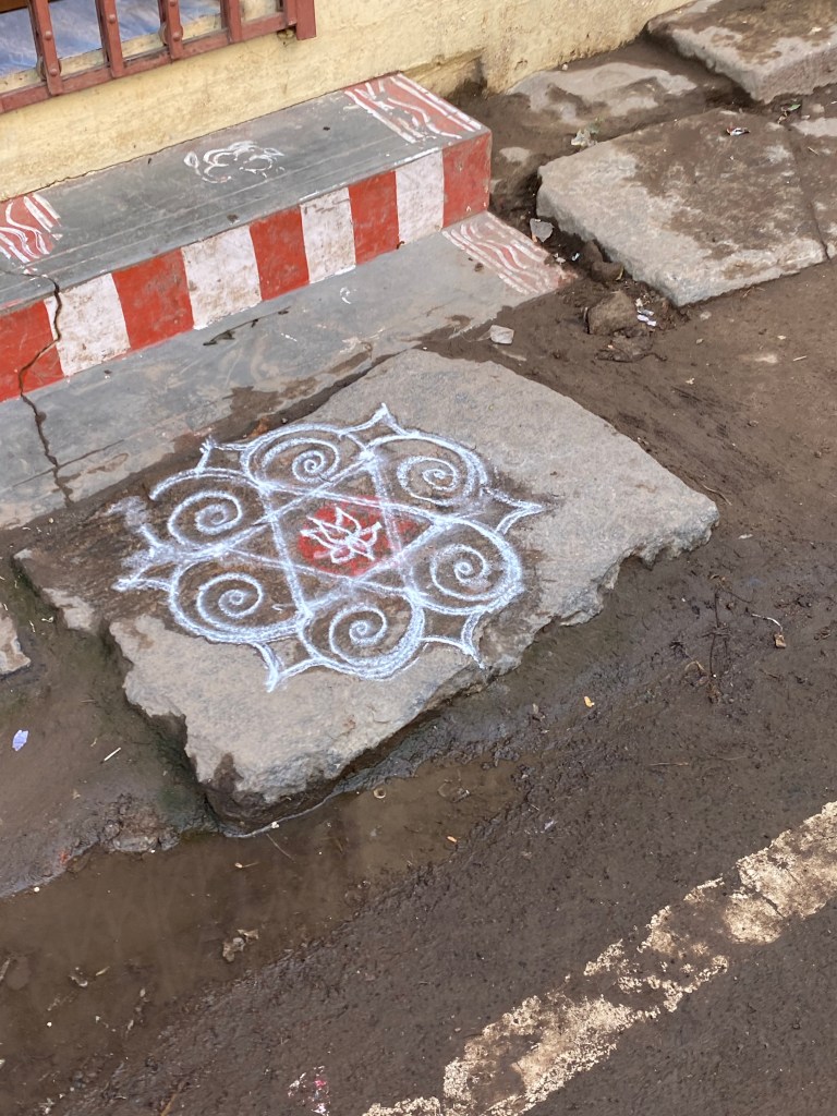 En el camino encontramos un templo pequeño, bueyes amarrados a las rejas de los negocios y para mi disfrute kolam en todas las puertas. En unas calles más amplias estaban metiendo unas grandes tuberías y más adelante un grupo de mujeres que cocinaban en la calle, le daban a la esquina unas pinceladas de color con sus saris de tonos vivos.
