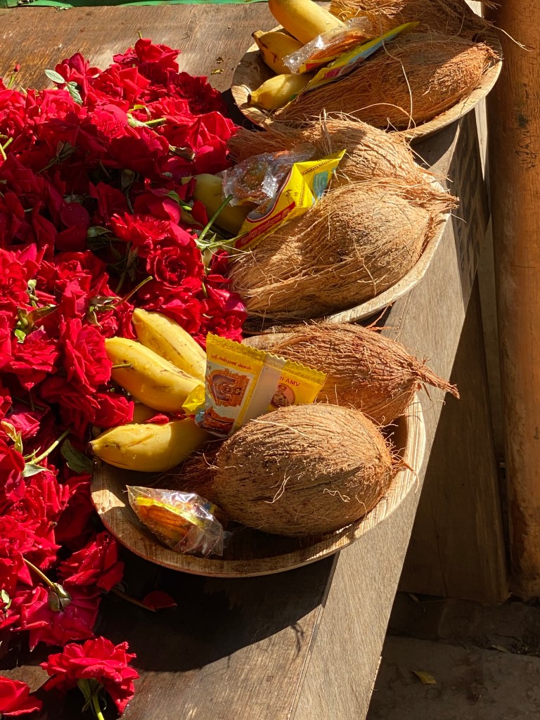 Según nos fuimos acercando, empezaron a aparecer las vendedoras de flores y de ofrendas. Había distintos tipos de guirnaldas de flores, las ofrendas tenían cocos, cambures, unos paqueticos y unas botellitas. Guiadas por Ragú llegamos a una de las entradas del templo y allí nos despedimos de nuestros zapatos. Pocos minutos más tarde, todas dejamos a Sekar a cargo de los teléfonos.