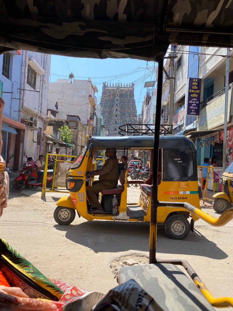 Yo iba muy entretenida, mirando al piso frente a las puertas de las casa, tomando fotos de los kolam y cuando levanté la vista, allí estaba, una de las torres del templo. Impresionante.
