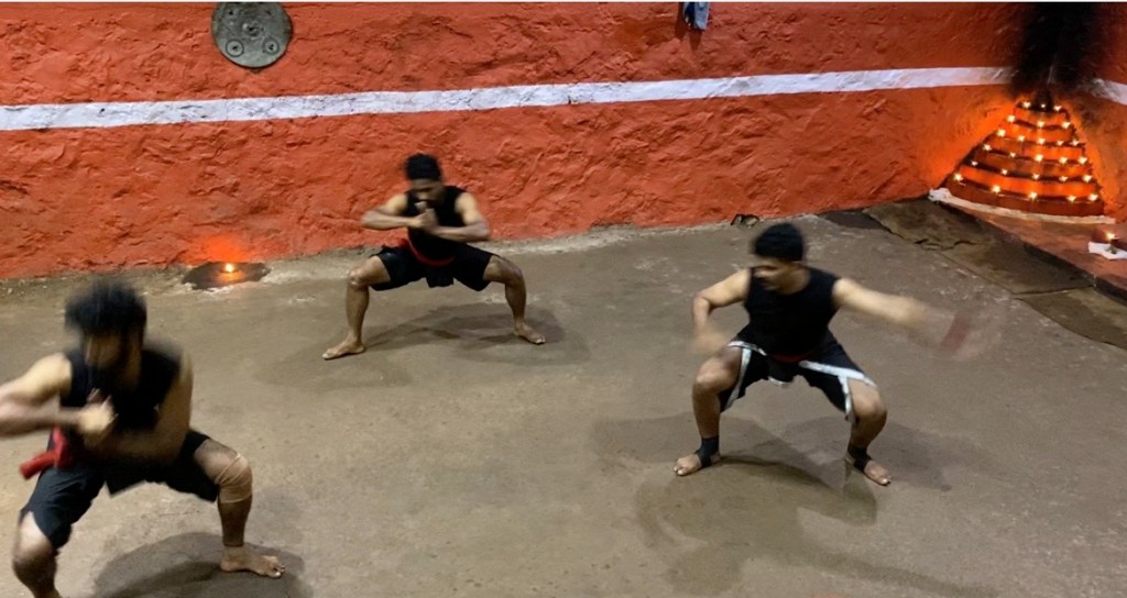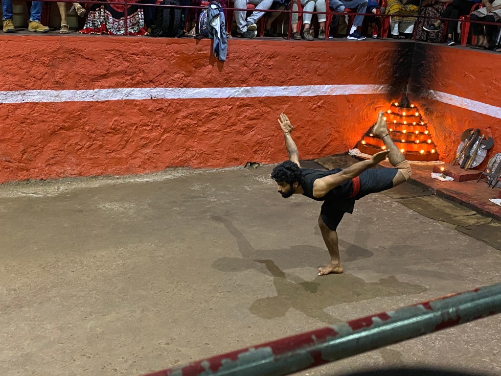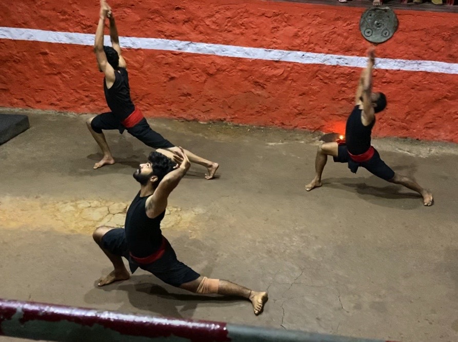 Llegó el momento de iniciar el espectáculo y un grupo de 5 jóvenes, vestidos de negro con una banda roja en la cintura y descalzos, se ubicaron mirando hacia las armas. Hubo anuncios y explicaciones, en malayalam. Los jóvenes empezaron a hacer distintos movimientos en grupo que lucían como preparatorios. Había saludos, reverencias y palabras. La flexibilidad que demostraban era impresionante.